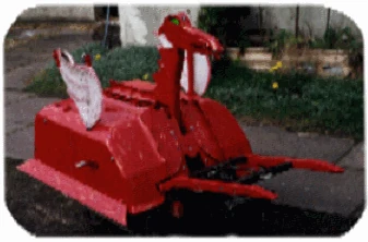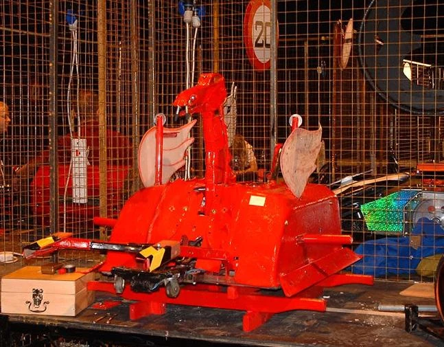 Scrap Dragon was a red wedged box-shaped robot designed to resemble a dragon. Its weapons were a small front lifter, a actuating head and mouth and a rear flywheel-powered flail which was meant to represent the dragon's 'tail'. The robot also featured a 'dragon's head' at the front which acted as a clamp, as well as a pair of wings with top-mounted spikes which acted as Scrap Dragon's srimech. Scrap Dragon was also initially armed with a flamethrower situated within its jaws, however due to the show's rules, this was removed before the qualifiers of Series 6.