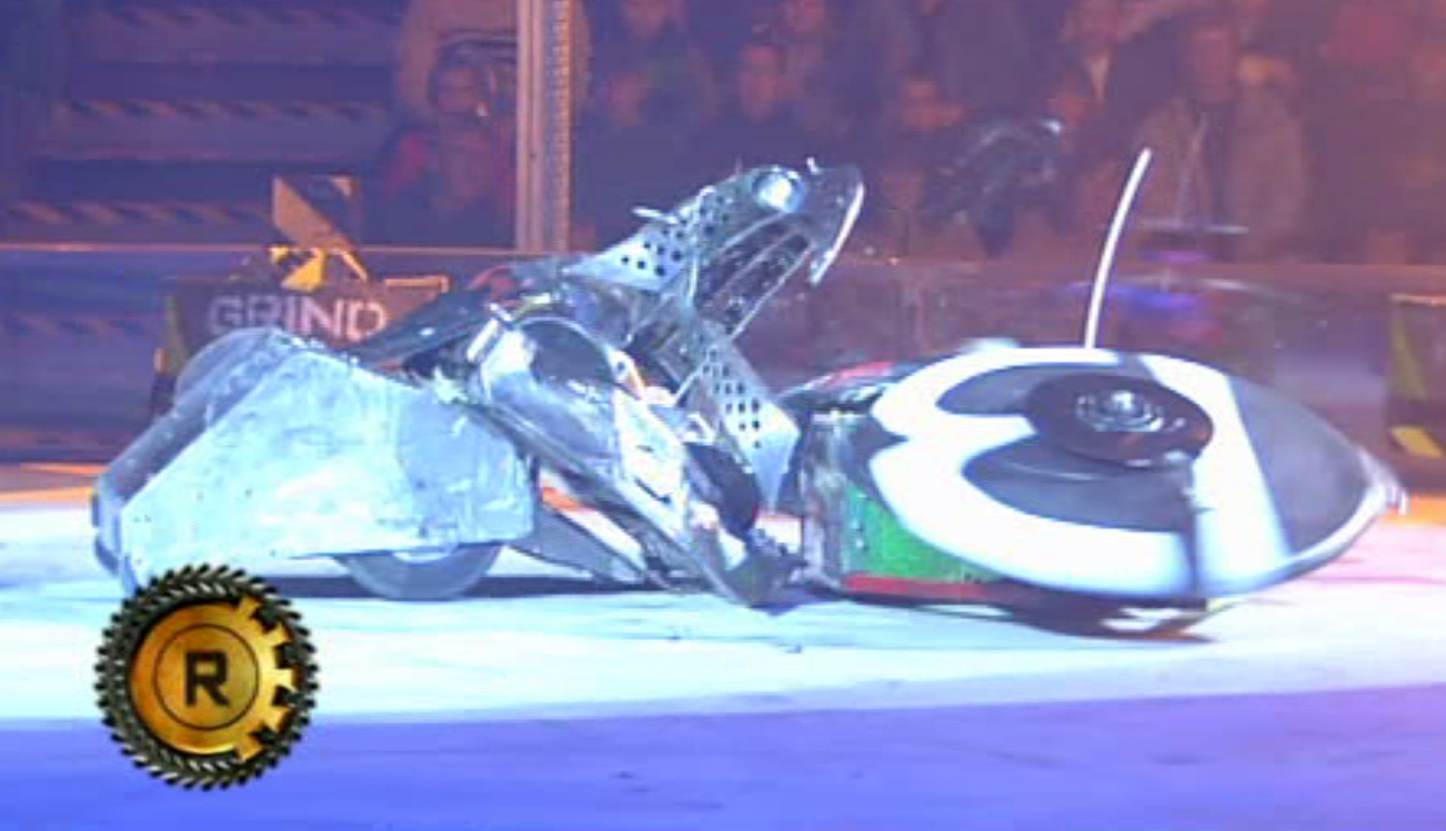 The first robot to attempt self-righting in the televised UK Series was Chaos, after being flipped over by Matilda during its Series 2 Heat Final against Mace. However, the first successful use of a srimech was by Cassius, also in Series 2, where it used its flipping arm to right itself after being overturned by Sir Killalot during its Pinball run.