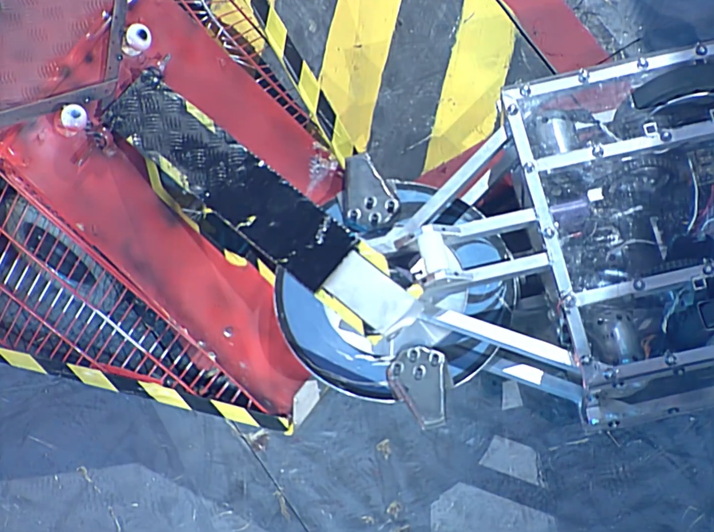 At the start of the battle all three robots charged at each other with Disc-O-Inferno's weapon causing some minor dents to the fragile armour. However, Disc-O-Inferno made contact with Shadow of Napalm and the electronics short circuited, causing the machine to turn off. Major Tom rammed Shadow of Napalm, but whilst Shadow of Napalm and Disc-O-Inferno both looked very lacking in mobility, Shadow of Napalm managed to move sluggishly away.