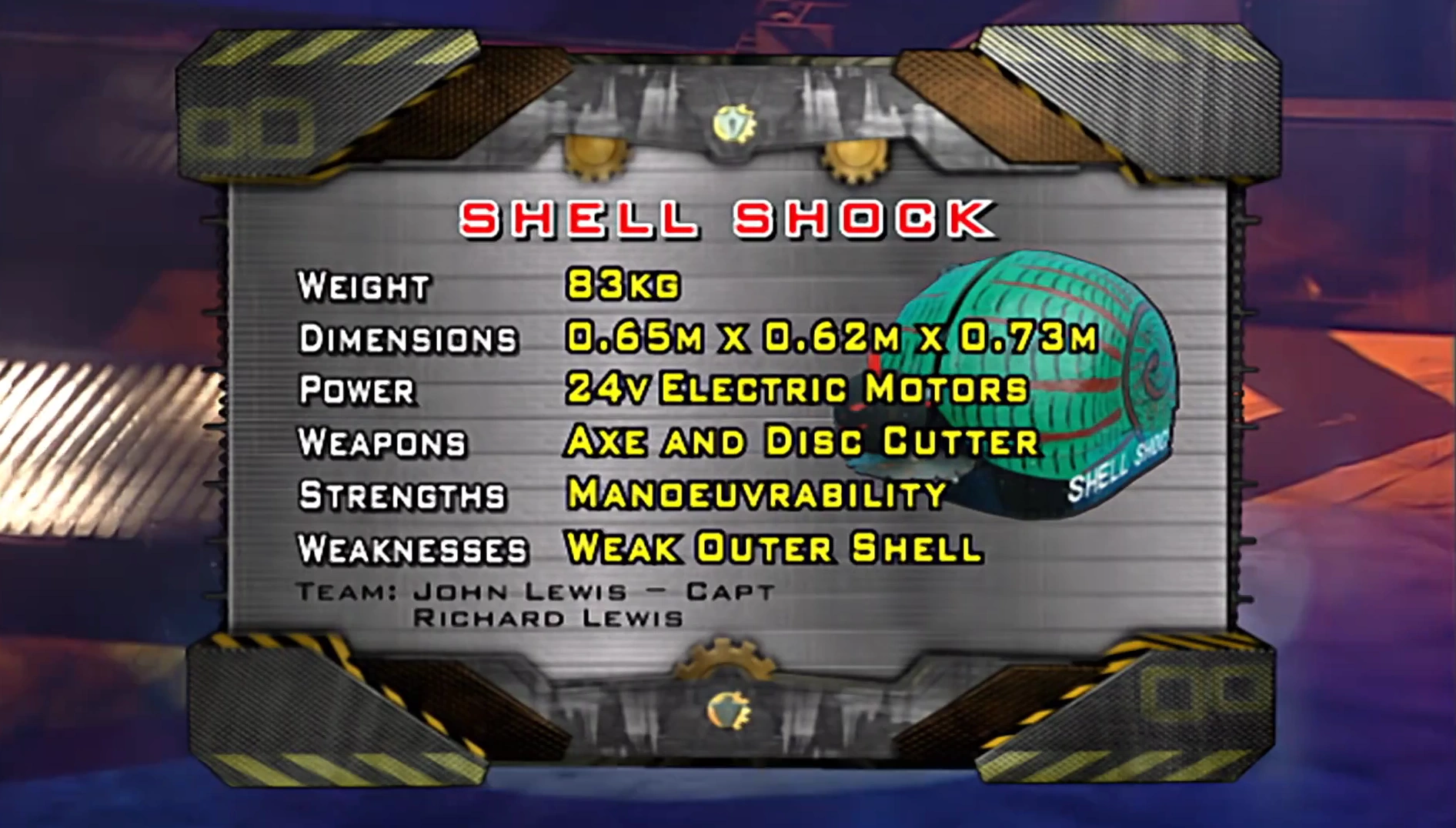 Shell Shock was designed to look like the shell of a snail, with an overhead axe possessing a "cute little face", as described by Jayne Middlemiss. This weapon was protected by the shell along with a small petrol-powered cutting disc at the front. Shell Shock also had two electric arms for self-righting that blended into the shell, though they failed to work when needed.