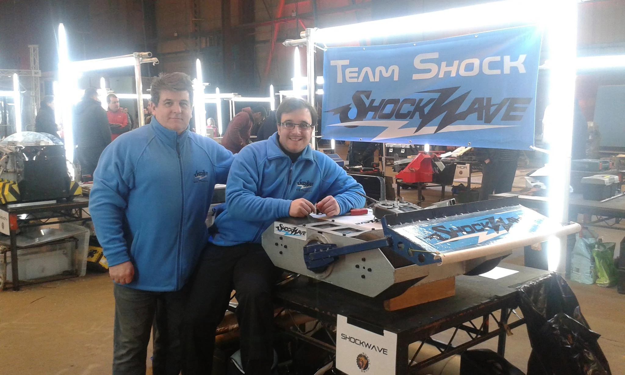 Shockwave was the first robot entered into Robot Wars by Team Shock, consisting of father-and-son team Will Thomas and Ian Thomas. Team captain Will designed and drove the robot, whilst his father Ian was the main builder, and did the mechanics.