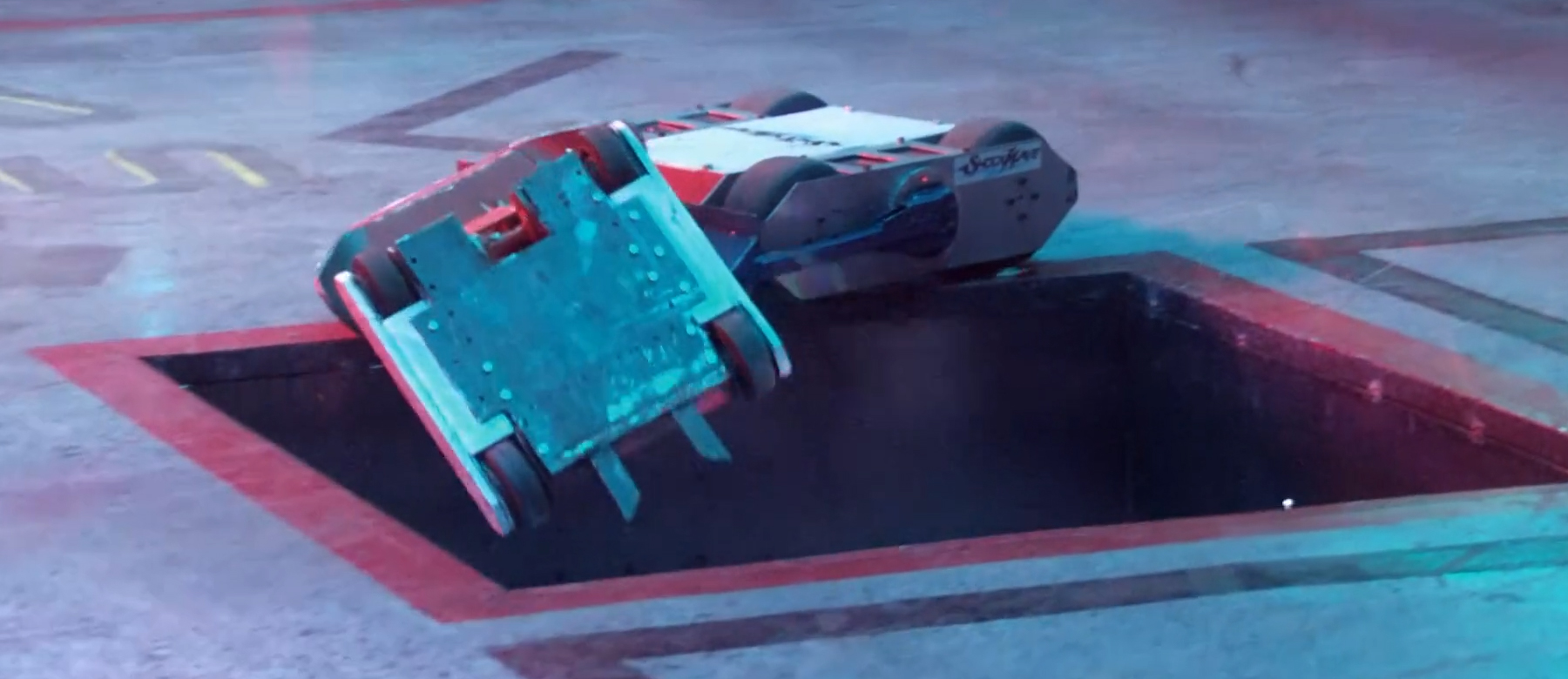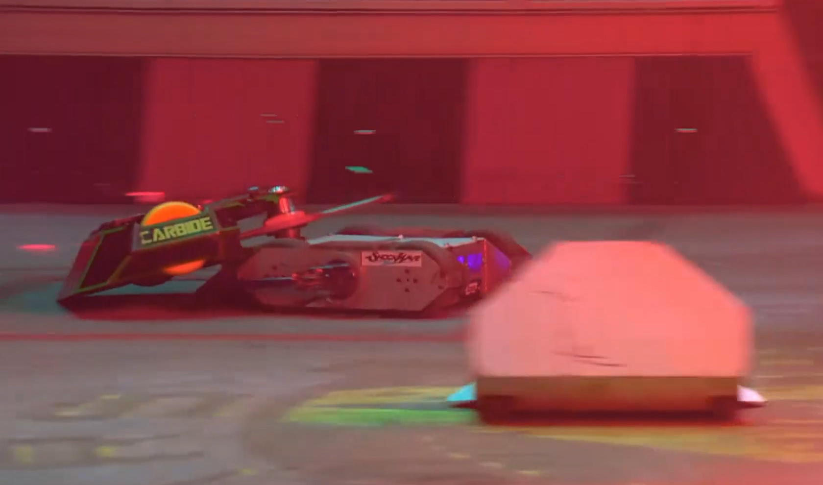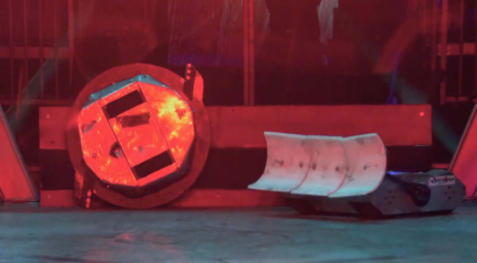 At the start of the battle, Shockwave drove towards Carbide, but as Carbide turned to face it with the blade spinning, Shockwave turned to avoid it, driving onto the Flame Pit. Shockwave tried to turn to use its scoop, but Carbide clipped the side with its spinning bar. Shockwave turned off the flames as Carbide drove onto the Flame Pit to attack again, driving into Sir Killalot's CPZ. Carbide turned to drive after Apollo, and Shockwave turned around, driving out of the CPZ as Sir Killalot came over. Shockwave charged at the side of Carbide, getting underneath with the scoop and ramming it across the arena. The edge of Carbide's rear wedge clipped the Floor Flipper as Shockwave pushed it across, but Shockwave kept pushing, forcing it against the arena wall by the trench.