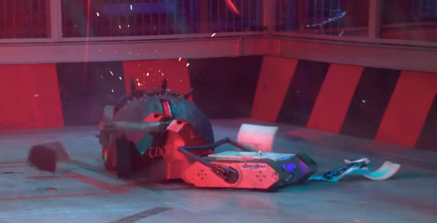 Shockwave turned, and as Tough as Nails rolled back down off the side wall, Shockwave tried to get under the side and lift it, but Tough as Nails turned a little as it pushed Thor, causing Shockwave to miss. Shockwave reversed against the arena wall, and Thor rammed Tough as Nails to a CPZ at the opposite side of the arena, pinning it in the corner and pushing it up against the wall. Shockwave drove in under the back of Thor, getting underneath it, but as it reversed, Thor slid off. Tough as Nails kept hold of Thor, and Thor pushed it back to the corner. Shockwave got under the side of Tough as Nails with its scoop, and Thor repeatedly axed Tough as Nails, which let go of Thor.