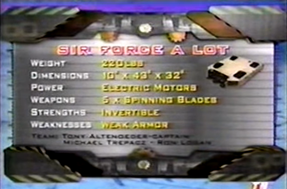 Sir Force A Lot was entered by Team Force, a team from New York. The team was formed when Tony Alternoeder and Andrew Lindsey met on an online forum, and worked together to enter Robotica. The two emailed plans to each other, then built Ram Force in Tony's machine shop in Buffalo, New York[1]. In Extreme Warriors, Tony Alternoder was joined by Michael Trzepacz and Ron Logon. Other members of the team included Tony's brother Mark, Rick Kurpiela and Cindee Altenoeder[2].