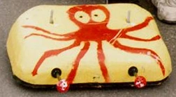 Slippery Strana's unusual name was derived from The Axle Grinders' decision to give their robot an 'elusive' and 'surreal' identity. The "Slippery" part was adopted as a result of the high top speeds of the robot's prototype, and in turn influenced the octopus logo on its bodyshell.[6] "Strana", meanwhile, was a portmanteau of "strawberry" and "banana", which not only alluded to the robot's yellow and red colour scheme, but also - according to the team's website - contained a hidden innuendo which complied with the family-friendly nature of Robot Wars.[7]