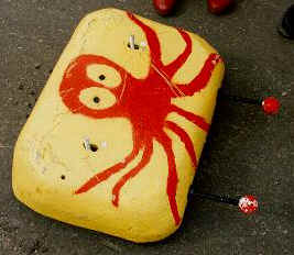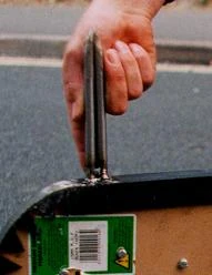 Slippery Strana was a rectangular-shaped robot with an MDF baseplate, rounded corners and a two-wheel drive system. The robot was armed with two custom 10-inch static spikes[2], weighing between 1-2kg each, while its bodyshell - decorated with a red octopus mascot - was made out of glassfibre, hardened resin and Kevlar. To determine the shell's shape, The Axle Grinders initially made a chicken wire mould, which was delivered to the team's sponsor, Matrix Mouldings of Bristol, for the fibre layers to be added.[3] Slippery Strana was powered by two 7.2V Bosch cordless drills running at 12 volts, one for each wheel, as well as a 12V gel battery for drive and a single 7.2V Bosch battery for its receiver. The drills allowed the robot to be highly manoeuvrable and capable of accelerating from 0 to three metres per second (approximately 6.7mph) in three seconds.[4]