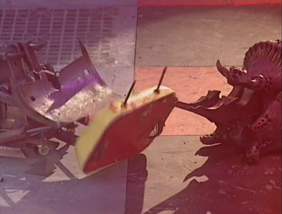 Matilda and Shunt closed in, with the former initially attempting to cut through Slippery Strana’s shell with her chainsaw, but without success. Slippery Strana was then rammed into Matilda by Shunt, who proceeded to pound its shell with his axe before trying to lift it forwards in front of a returning Matilda. Slippery Strana’s spikes caught Matilda’s tusks as it was pushed back into Shunt’s scoop; after sustaining one more axe blow, it was flipped by both House Robots before being levered back onto its wheels. These attacks resulted in Slippery Strana regaining full drive; after turning round, it proceeded to stab the side of Matilda with its spikes, before escaping from the PPZ and driving past Dead Metal.