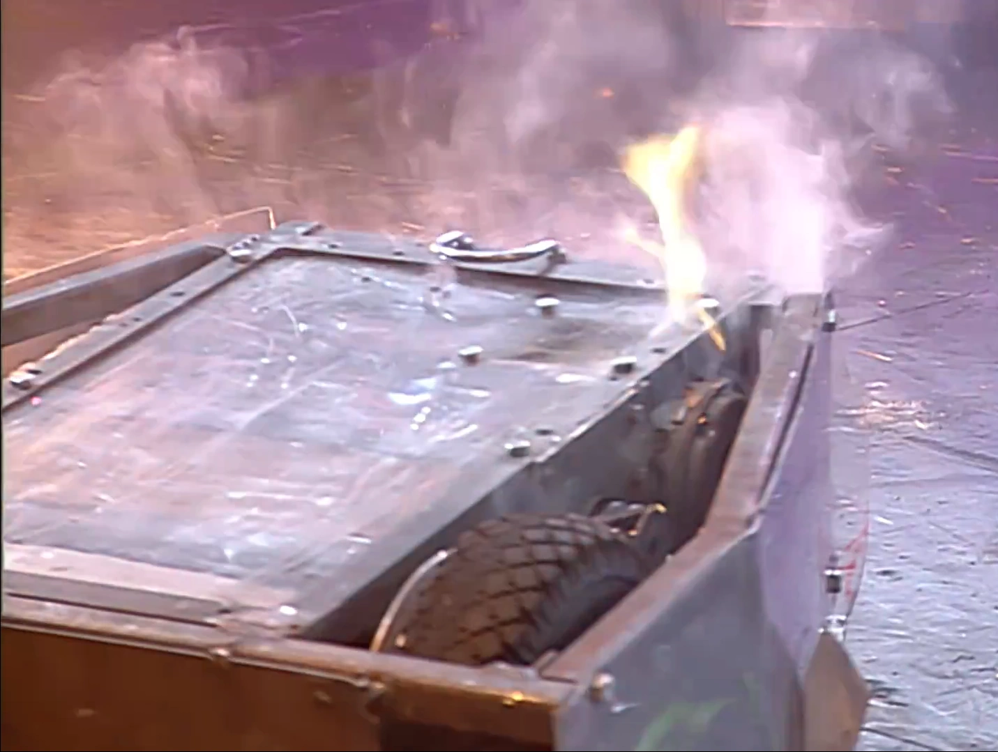 Both robots began by dodging each other, before Small Torque rammed into the back of Eric with its disc as it sat on a flame jet. Small Torque escaped, and continued to drive round and ram Eric, at one point grinding against one of Eric's wheels. However, it reversed into Sergeant Bash's CPZ and was flipped over by Eric as it escaped, allowing Small Torque's disc to briefly propel it across the floor. Despite this, Small Torque suddenly stopped moving, and began smoking as its internals caught fire and Eric attempted to flip it again. This rendered Small Torque completely immobilised and open to attack from the House Robots, eliminating it from the Fourth Wars.