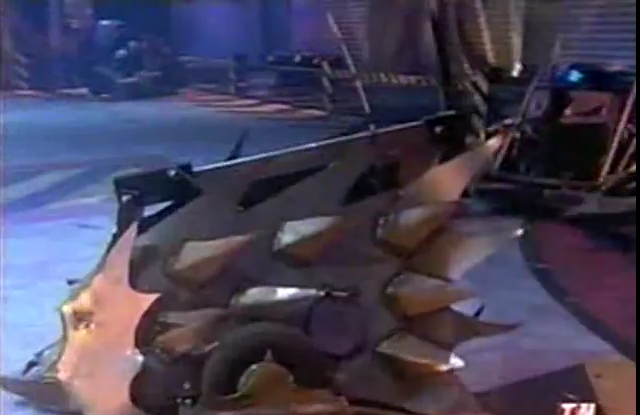 It immediately approached Manta as the latter attempted to position itself for an attack, but was rammed side-on near the Flame Pit before being pushed over it. Spike was rammed again by Manta as it spun away from the Flame Pit, before driving towards Dead Metal and being pushed across the arena by Manta. It reversed towards the Pit and was rammed into the wall by Manta, where it became immobilized before Sir Killalot crumpled through its side as he forced it against the Pit release button. Sir Killalot dragged and spun Spike across the arena, before it was released, landed on its side, and shoved into the Pit by Manta. This eliminated Spike from the Civil War.