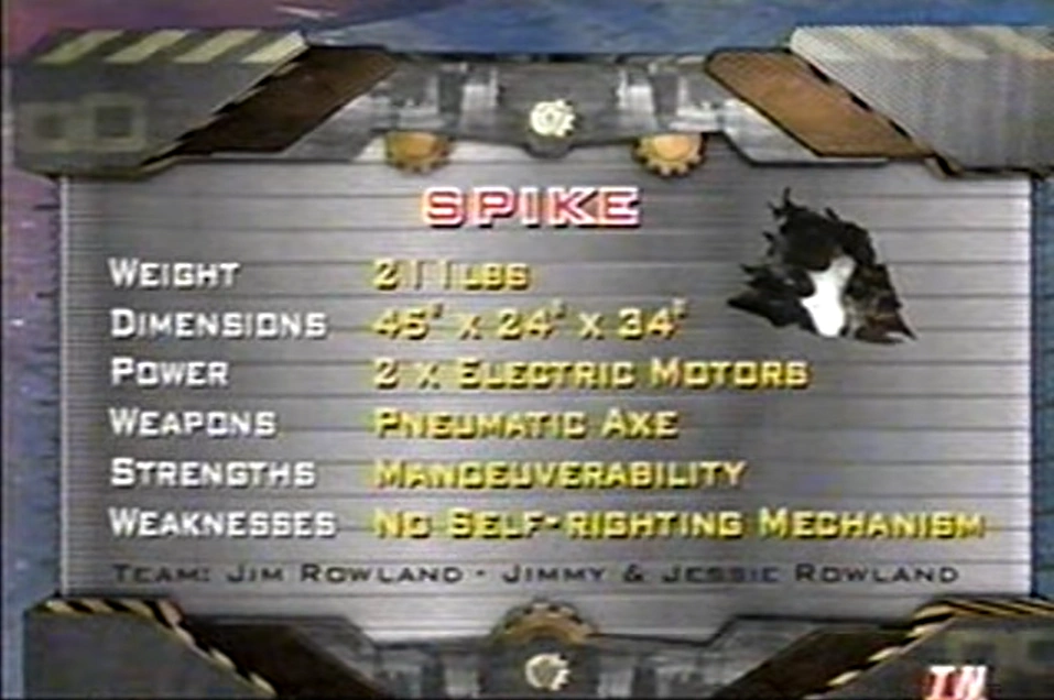 Spike was entered by Team Buck-Eyed Bots, usually known as Sinclair Robotics when competing with their main robot Spartacus. Spike was loaned to the team after their 98lb competitor Spartacus was badly damaged by Drillzilla and Panzer Mk2.