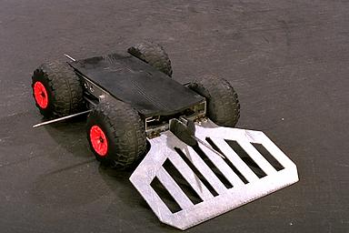 A set of gearmotors enabled Spiked Master to be agile and have a high top speed. However, its compact size and resultingly low mass meant that the damage potential of its rams was minimal. For 1996, a spatula-like scoop blade was added beneath the front spike, with the aim of breaching opponents' ground clearances.[1]