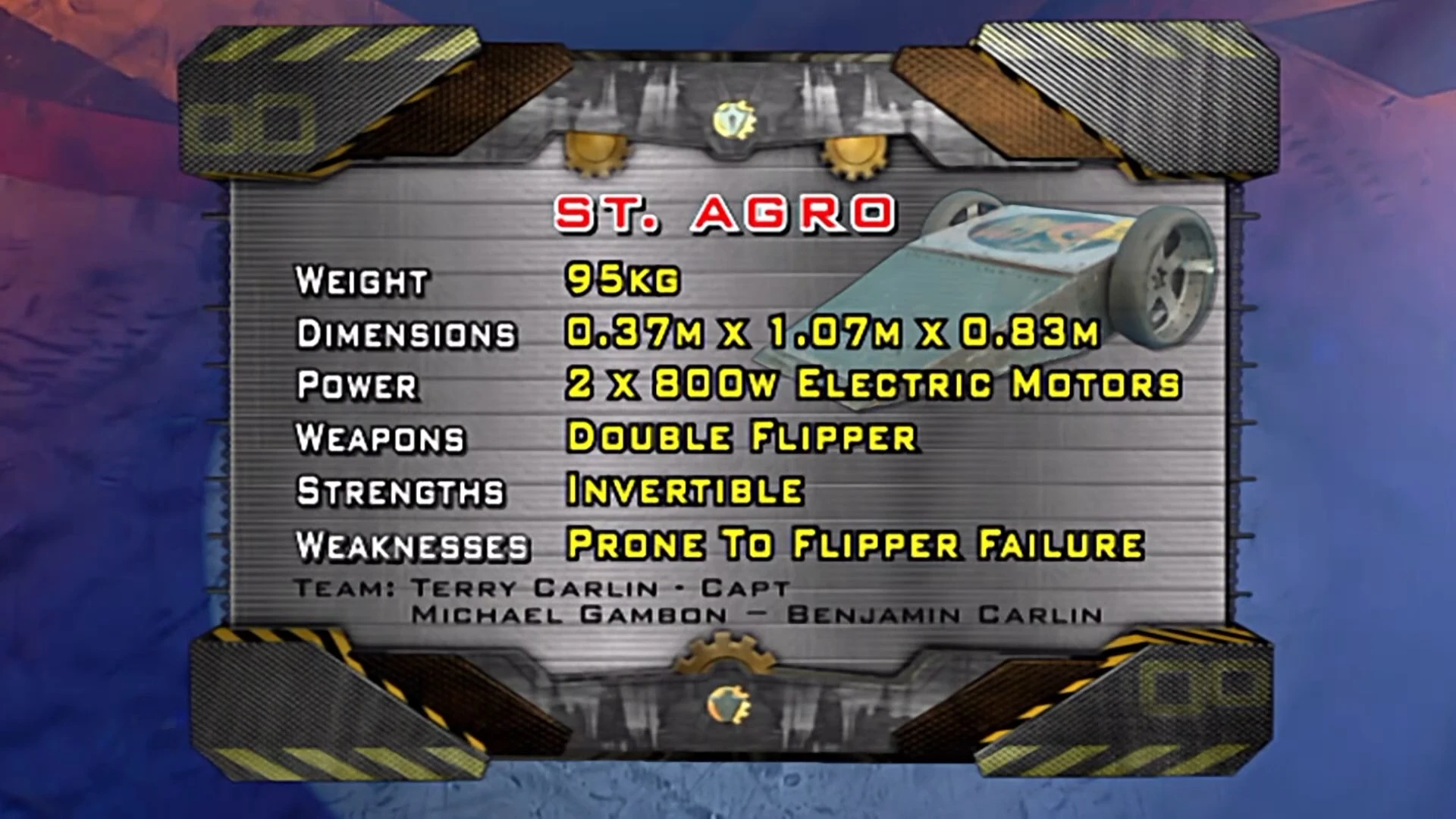 St. Agro was a two-wheeled, invertible wedge-shaped robot driven by a pair of 800W motors with custom-made gearboxes, and featuring a chassis and batteries salvaged from a Merlin helicopter. The robot was armed with an unusual "double-sided double flipper", which was a pneumatic flipper that would open out on both the top and bottom of the robot with the aid of four linkage bars attached to the piston. This allowed St. Agro to attack efficiently even when it was inverted, while the robot also featured a top speed of 12 mph. St. Agro initially had black wheels with rubber tyres for its Series 6 appearance, which were changed to custom five-spoke wheels for Series 7. These wheels had small spikes on them for traction, much like Wheely Big Cheese.
