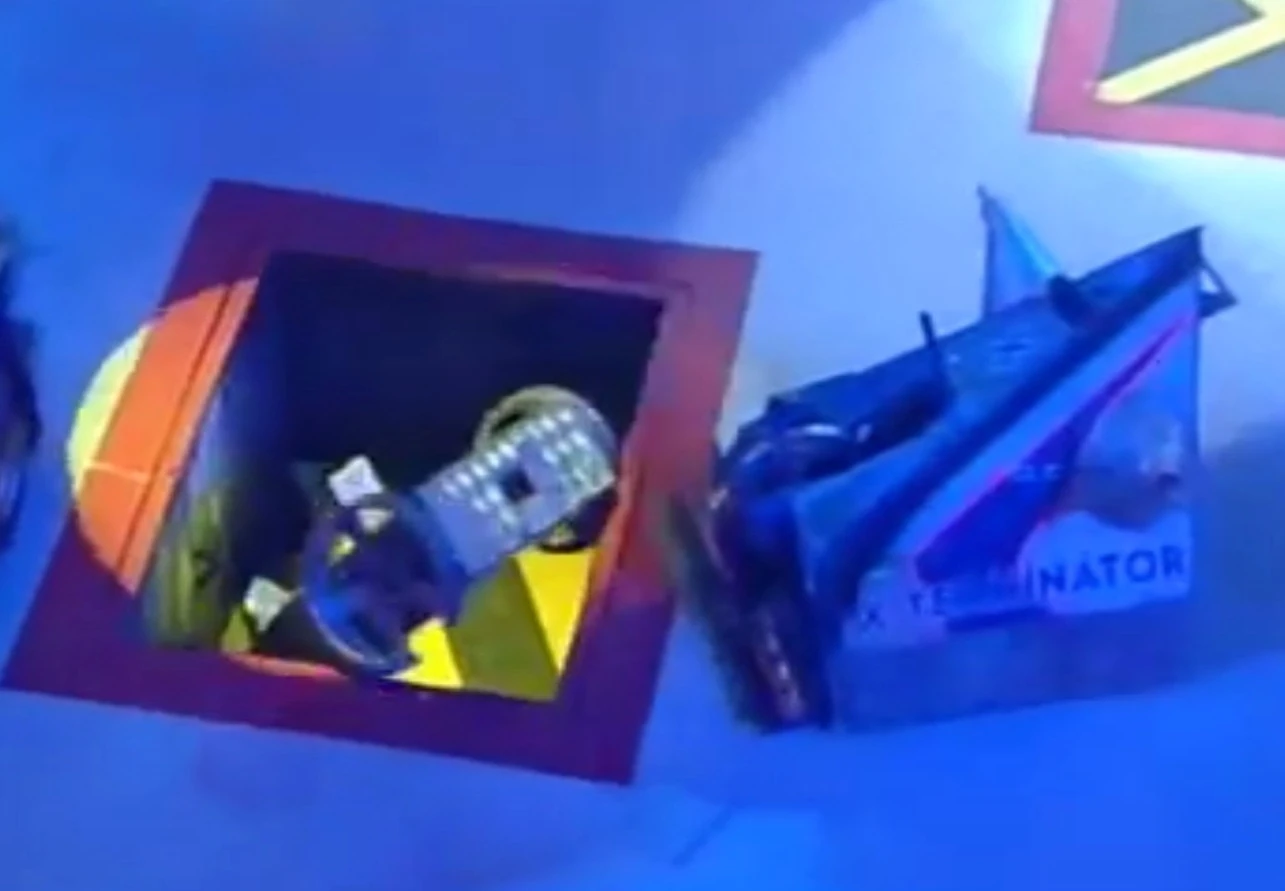 St. Agro reversed, then drove back at X-Terminator, only for X-Terminator to buckle the flipper front upwards. St. Agro turned around drove down the arena. After driving into the wall, St. Agro opened the Pit, and X-Terminator came in behind it, hitting the back and flipping the robot against the bottom arena wall three times in quick succession.