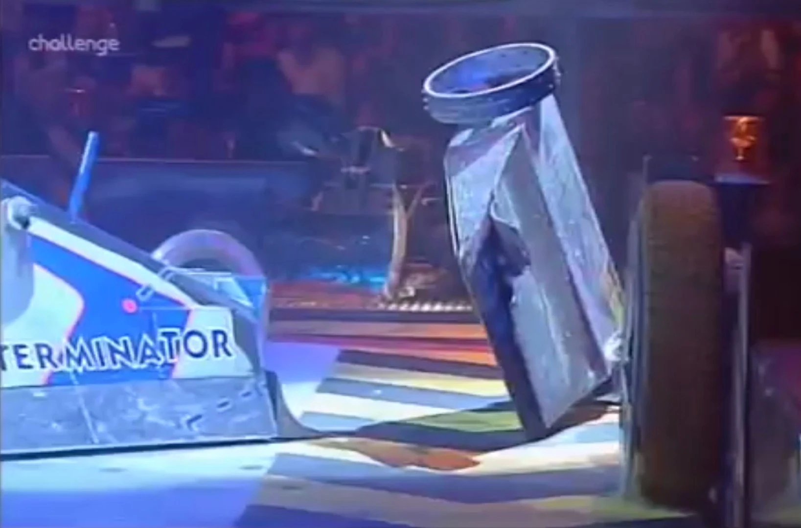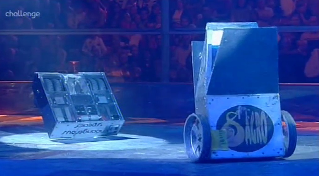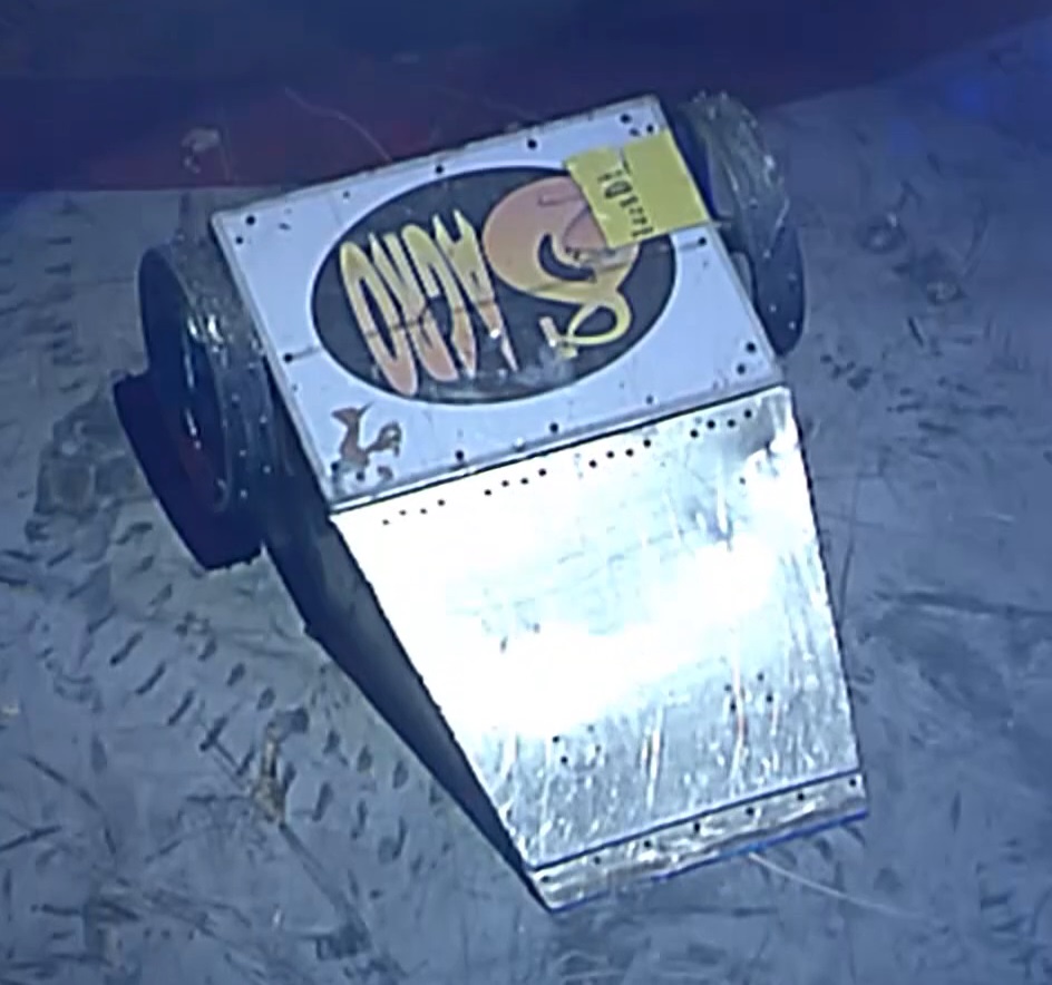 However, after this missed flip, the flippers became stuck open, so St. Agro drove down the arena, away from the other robots, and opened the Pit. St. Agro was attacked by Comengetorix, who tried to axe on its wheels, but narrowly missed. St. Agro started pushing Warhog, but S.M.I.D.S.Y. started pushing it around the arena. St. Agro managed to get away briefly, but S.M.I.D.S.Y. kept after it, and when St. Agro drove close to the Pit, S.M.I.D.S.Y. took advantage, getting behind it and pushing it straight in. After a fairly heated battle, St. Agro was eventually followed by Warhog as S.M.I.D.S.Y. gave it a piggy-back to the Pit.