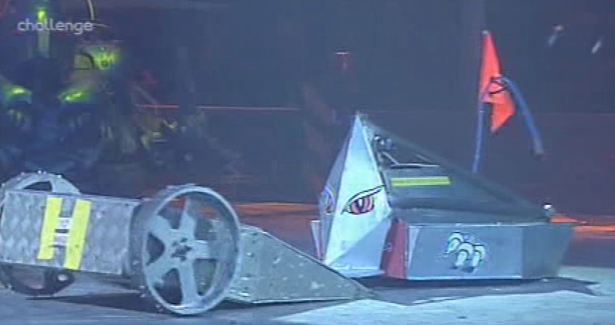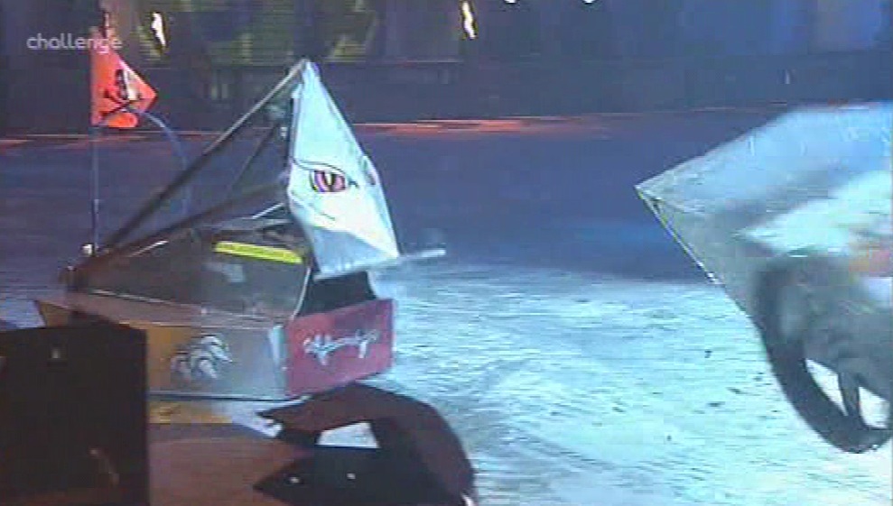 Ceros tried to self-right, but Matilda came out as it did so, blocking it as it tried to flip itself over. Ceros was stuck up against the arena wall, and Matilda hit it with the flywheel. Ceros' flipper was no longer working, leaving it unable to self-right. Refbot counted Ceros out, and Matilda reversed into Ceros and tossed it out of the arena with her flywheel.