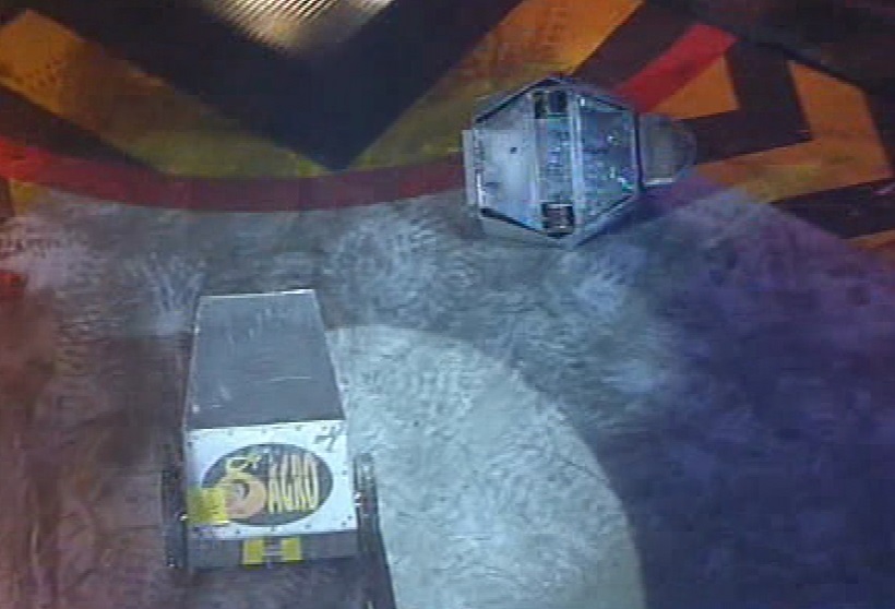St. Agro turned around and drove at the front of Ceros as it was by the Pit, but Ceros got its flipper under the front of St. Agro and flipped it back. Ceros turned around, but could not get away in time. St. Agro got beside it and tried to push it down, but fired the flipper and Ceros managed to turn away. St. Agro reversed for another charge, but missed its charge. As it tried to get in the right position, St. Agro drove in front of Ceros, and Ceros nearly flipped it into the Pit, with St. Agro narrowly being able to reverse in time. St. Agro drove after Ceros, but drove too close to Matilda, who hit one of St. Agro's wheels with her flywheel, cutting off part of the wheel.