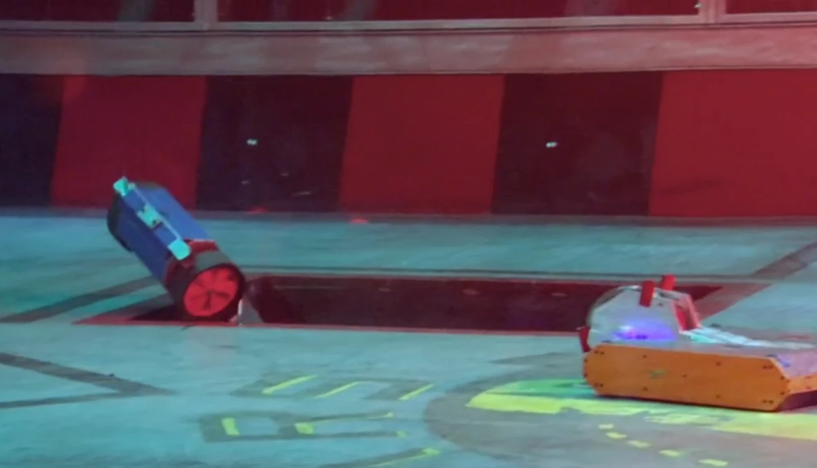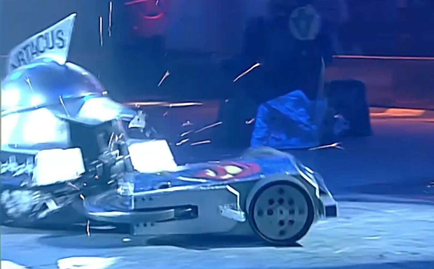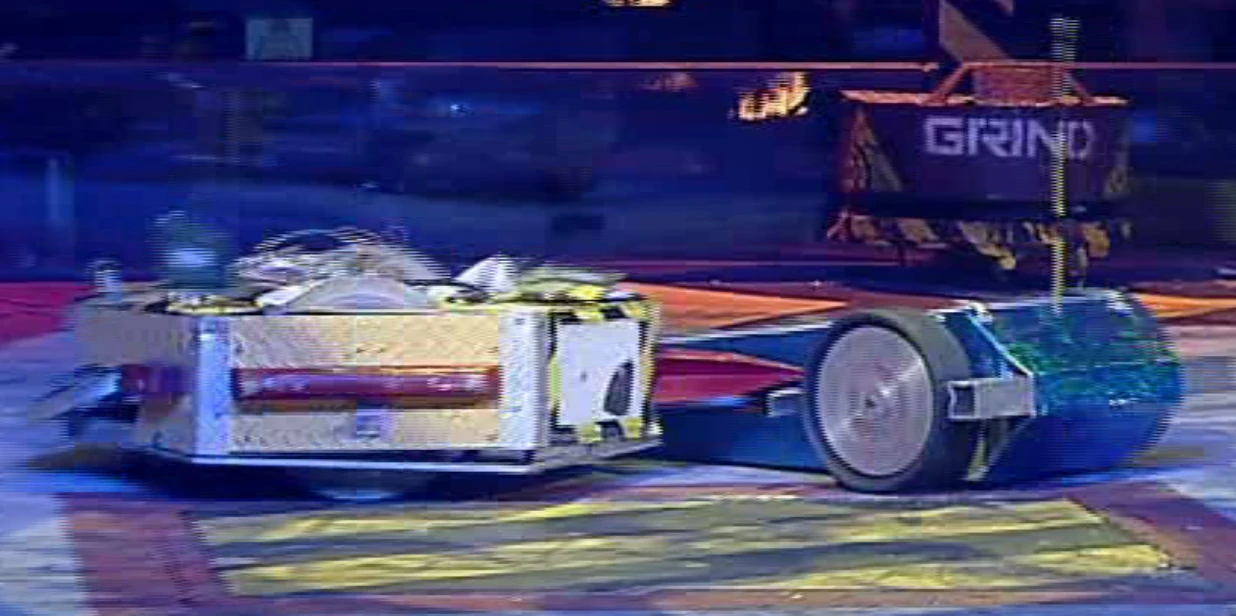 After a couple more hits on the wheels, the tyre was broken from one of the wheels, leaving the wheel spinning inside the tyre. Blows from Supernova had also caused a gash in Ming 3's side and a piece of armour had been ripped from the front. Ming 3 could not move forward, rocking back and forth on one wheel.