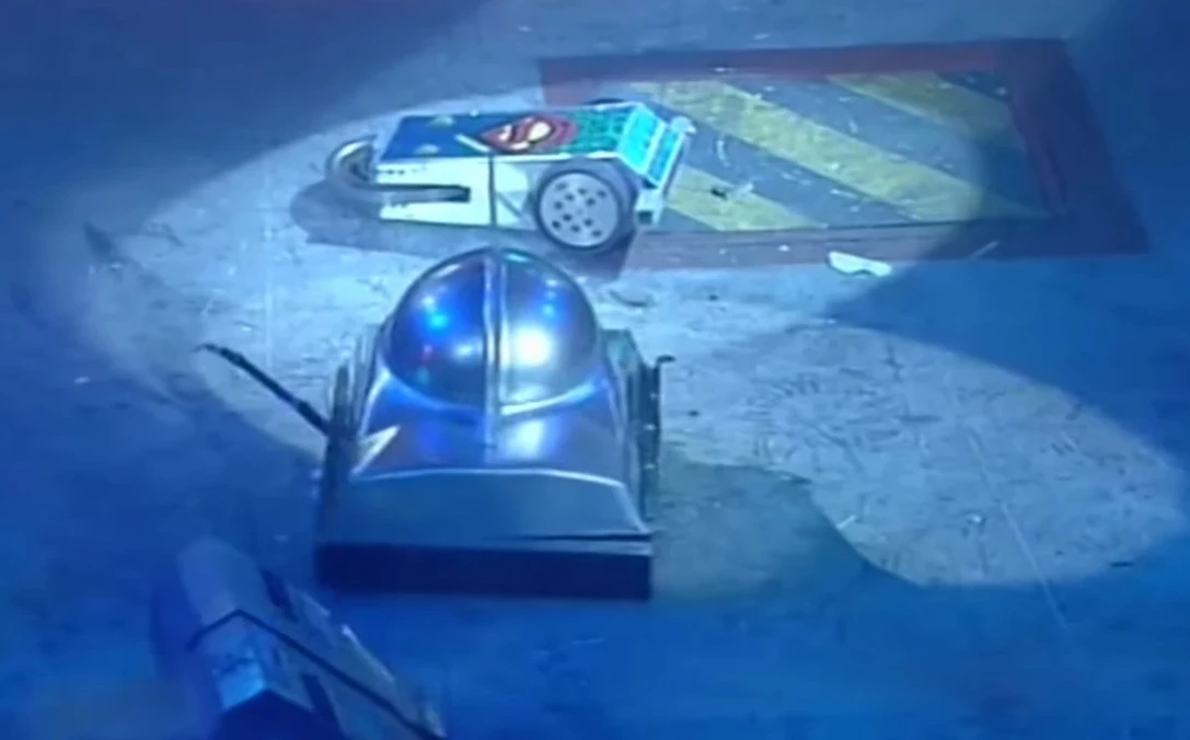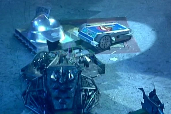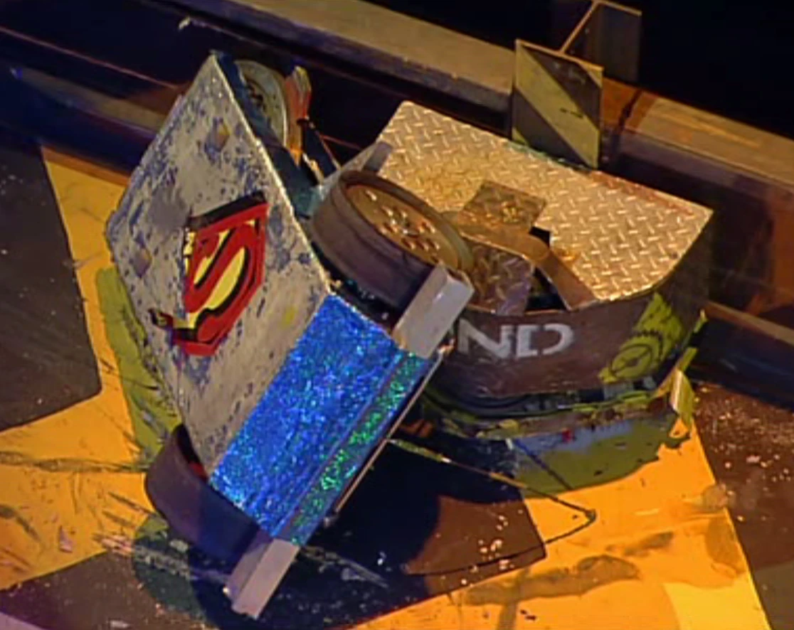 Supernova slowly moved in again, choosing to attack the front, but drove at the wrong angle, so merely went over the wedge and past Ming 3. Supernova tried again, charging at Ming 3's front, but Ming 3 turned at the right time as Supernova went up the wedge, meaning Supernova's disc did not hit the crusher, and Supernova slipped off the wedge as Ming 3 continued to turn. Supernova turned around, but drove over the wedge again. Supernova got at Ming 3's side, knocking it back with the disc. Ming 3 could still only spin on one wheel, and Supernova ripped off some armour on the back, then hit the other wheel, breaking it. Ming 3 could now not move at all, and was counted out by Refbot. Shunt pushed it onto the Floor Flipper, which threw it, then pitted Ming 3, cementing Supernova's victory.