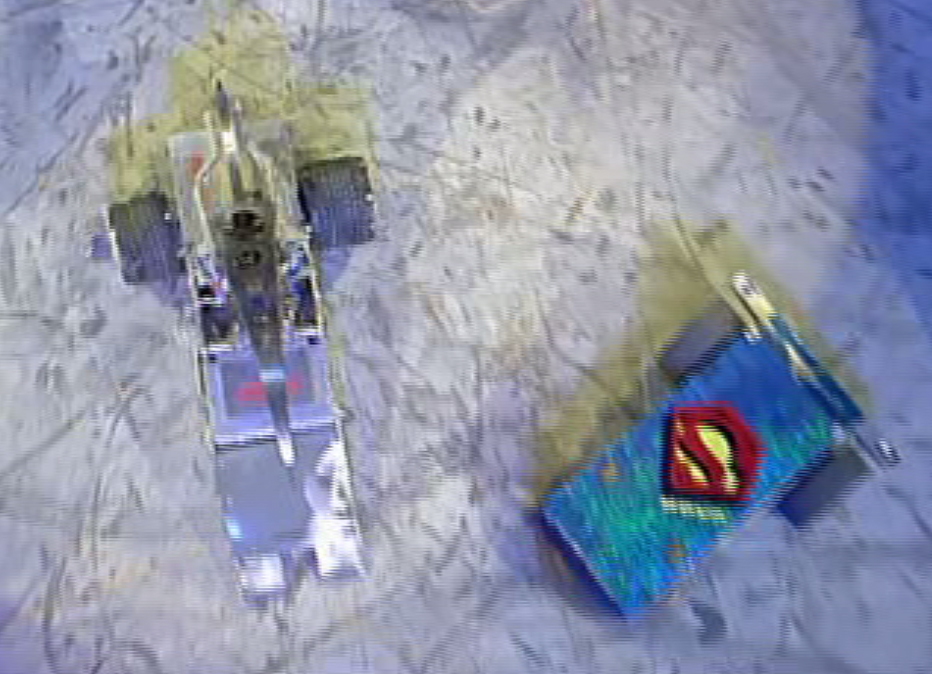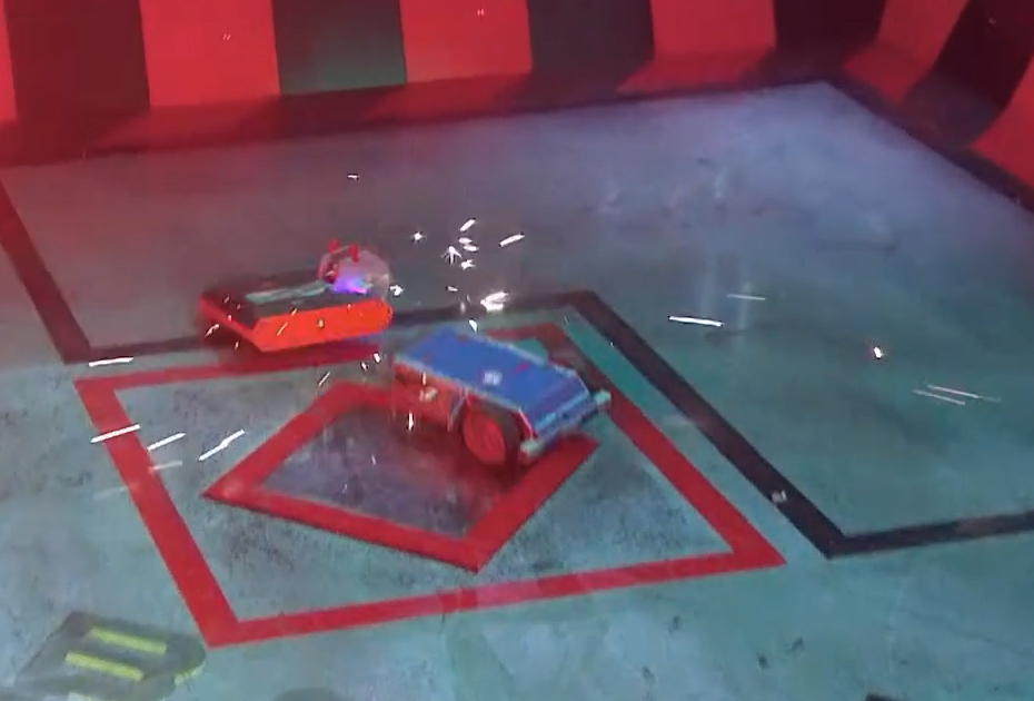 At the start of the battle, Supernova once again turned its rear-end towards the opponent before its weapon was up to speed. Supernova then chased Ironside3 but attacked its opponent at the wrong angle and suffered a hit as a result. Sparks flew as Ironside3 spun onto the closed Pit panel, and Supernova recoiled towards the centre of the arena. Supernova struggled to move away as Ironside3 hit it twice more in rapid succession, the attacks damaging its left-hand wheel and hampering its mobility.