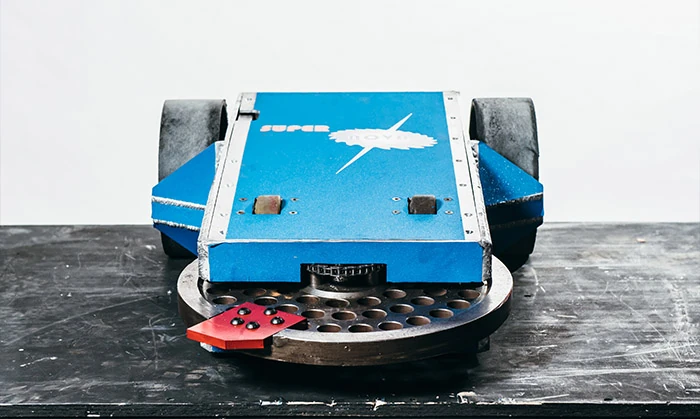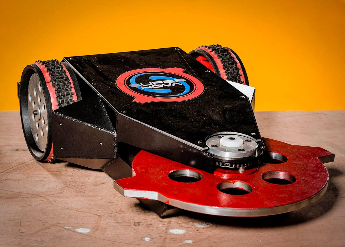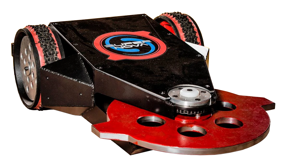 For Series 9, a new build of Supernova was introduced, with a revised chassis and a brand-new spinning disc made out of one piece of hardened steel. The new disc still weighed 22kg and spun at 2,500rpm, but was now one solid disc which had two teeth integrated into the disc in order to prevent them from shearing off upon contact with opponents. Supernova's armour now consisted of 3-6mm HARDOX. The team also lined Supernova's wheels with rubber from bicycle tyre treads in an attempt to combat the robot's recurring problem of rebounding away from robots upon contact. The Series 9 version of Supernova was intended to use brushless motors on its weapon system, but this could not be implemented due to time constraints[7], which meant that Supernova retained its chain-driven weapon system which ultimately sheared in combat following its win against Frostbite.