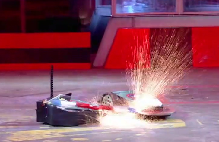 Another couple of hits from Ironside3 caused more sparks to fly and Supernova's wheel to lock up completely, with Supernova driving in circles over the arena spikes before suddenly stopping completely. Ironside3 hit Supernova's side again, sending sparks and shards of metal flying, before Shunt came out of his CPZ to axe Supernova, the latter's disc hitting his scoop and sending yet more sparks flying. Ironside3 slammed into Supernova one more time before it was fully counted out, while Sir Killalot ended the battle by holding Supernova over the Flame Pit.