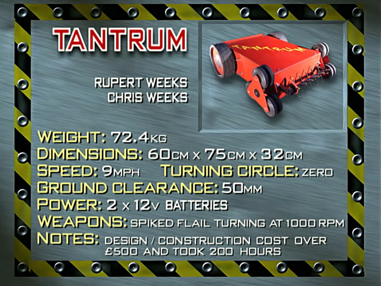 Tantrum was a red, invertible box-shaped robot, featuring an unusual eight-wheeled configuration. The robot had a set of six small front wheels arranged on triangular-shaped mounts, similar to those later found on Series 3 competitor Trident, as well as two larger wheels at the rear, taken from a golf trolley. Tantrum's weapons consisted of a 25mm diameter sharpened steel flail, rotating at 1,000rpm and a spring-loaded rear ramming bumper.