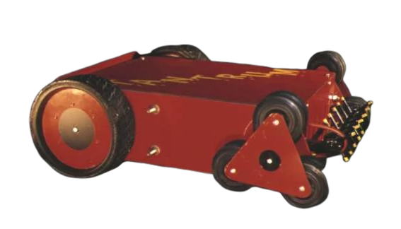 - "...they at first went for an ingenious and ambitious drive system including caterpillar tracks and a freely spinning triple-wheel assembly mounted on the front of the robot, to allow it to climb over obstacles. The tracks, made from pieces of car tyre, caused the robot to be far too difficult to control, so they were removed in favour of two large rear drive wheels (powered by two 50-watt wheelchair motors), although the front mounted triple wheel assembly was retained. The entire robot had been designed around the track system, so when the tracks were abandoned, the strength of the front wheel assembly had to be increased by using heavy duty castors"