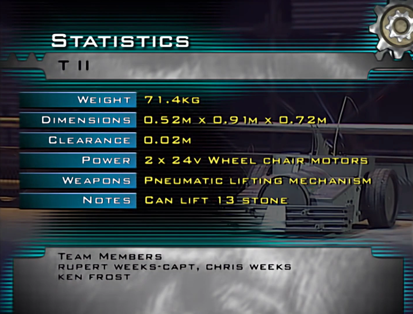 The lifting device was constructed from 16mm box section steel and powered by a 50mm pneumatic cylinder.[2] The chassis was modified, with the addition of a piece of sewer pipe in the middle. T 2 also featured a set of red eyes and a mohawk on its top-rear armour; these, along with the robot's shape, lead to Philippa Forrester describing it as "Thomas the Tank Engine with a punk-rocker haircut". The robot was quoted as having a top speed of 15mph, and was powered by two 24V wheelchair motors.