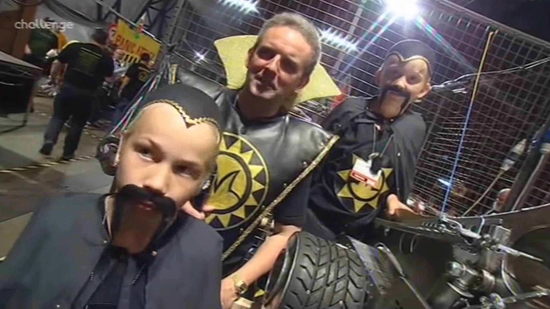 This element of the team's Robot Wars persona was gradually deemphasised in later appearances, with only Andrew wearing a full costume in Series 5-7 and the Nickelodeon series. Interviews conducted in The Pits concurrently switched to focusing on their robots' designs, armament and battle draws, as was the case in Series 3-4.