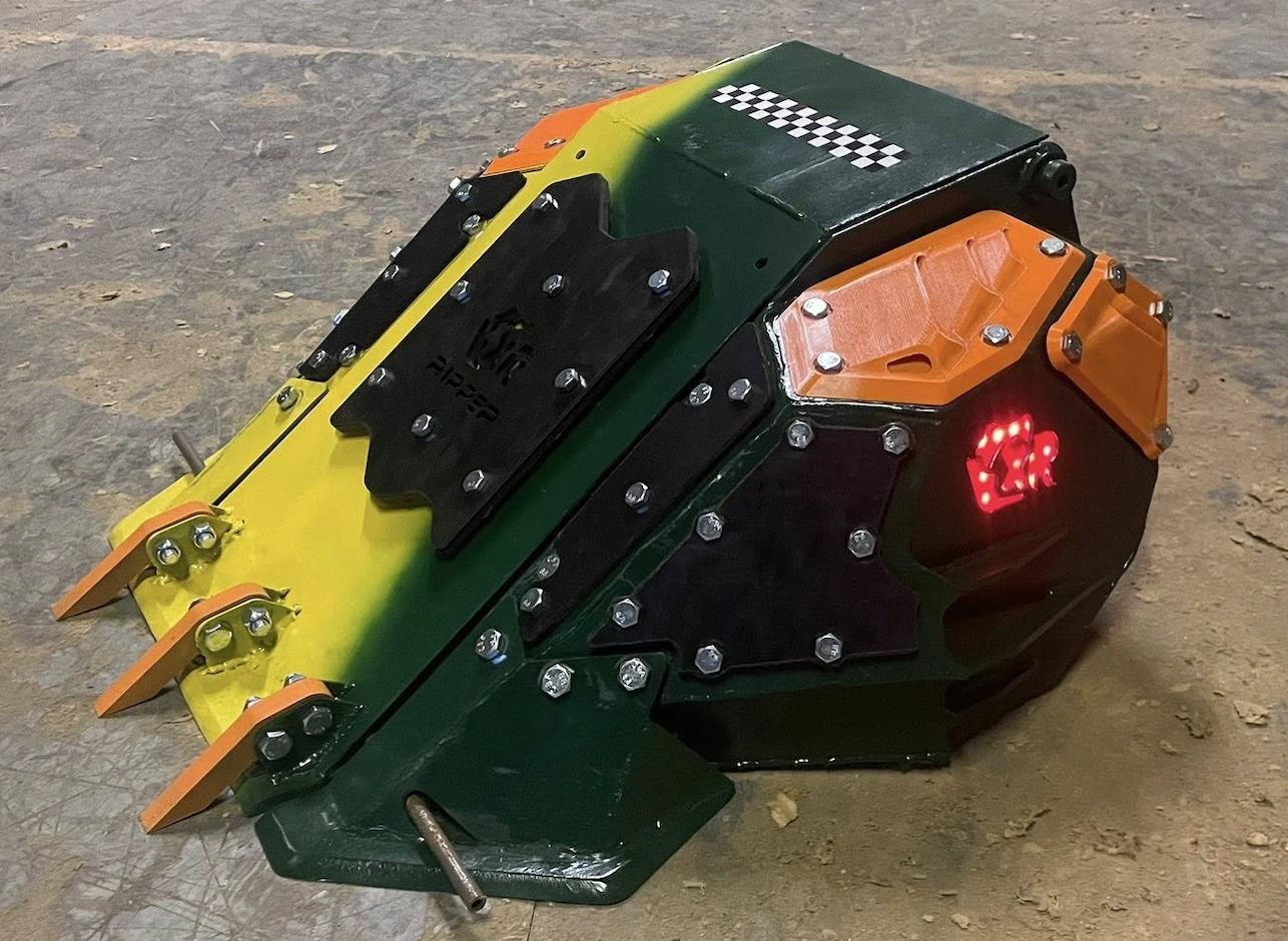 In preparation for the 2025 Extreme Robots tour, another brand-new Ripper build - Ripper 8 - was designed and built by Team Roaming Robots in collaboration with Team Immersion. Designed to address issues experienced by Ripper VII, Ripper 8 reverts to a conventional two-wheeled layout and flipper design, while featuring improved brushless drive and a 4kg CO2 supply. The robot's dark green and yellow paint scheme incorporates bright orange armour panels and wedgelets, representing the primary colour of "Team Wolfpack" at Extreme Robots shows.[56][57]