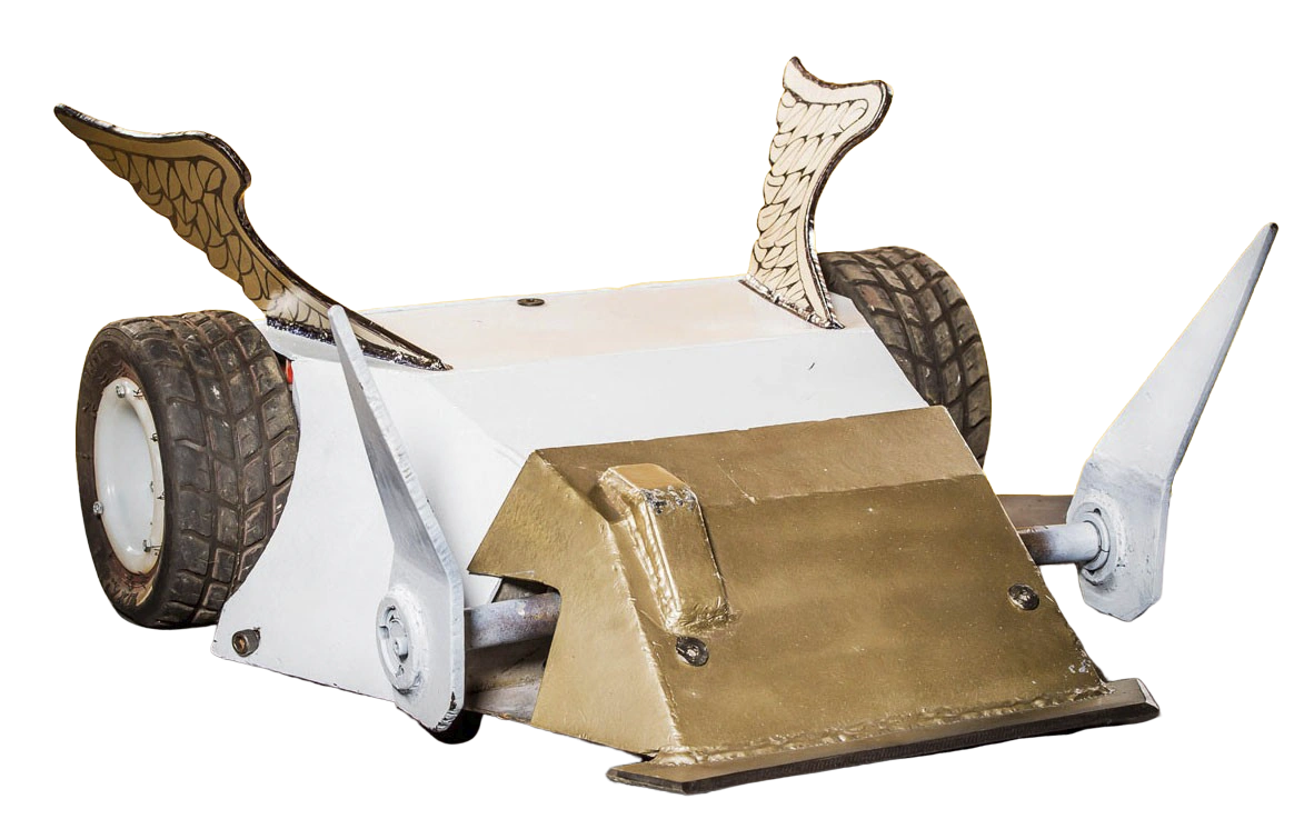 The team's first ventures were with their namesake heavyweight The Saint (also shortened to Saint), a two-wheeled thwackbot initially equipped with a horizontally-mounted pickaxe. The pickaxe enabled it to strike opponents while spinning on the spot. This early build of The Saint would be succeeded by two versions with an axlebot design and overhead 'sword'. The second incarnation (also referred to as St Hammer) incorporated green wheels and a box-shaped chassis, while the third - still active as of November 2024 - features a half barrel-shaped body and white HDPE materials similar to Gabriel. At the 2017 Robots Live! Stevenage event, The Saint finished seventh overall in the FRA UK Championship and fought in numerous whiteboard battles.[1]