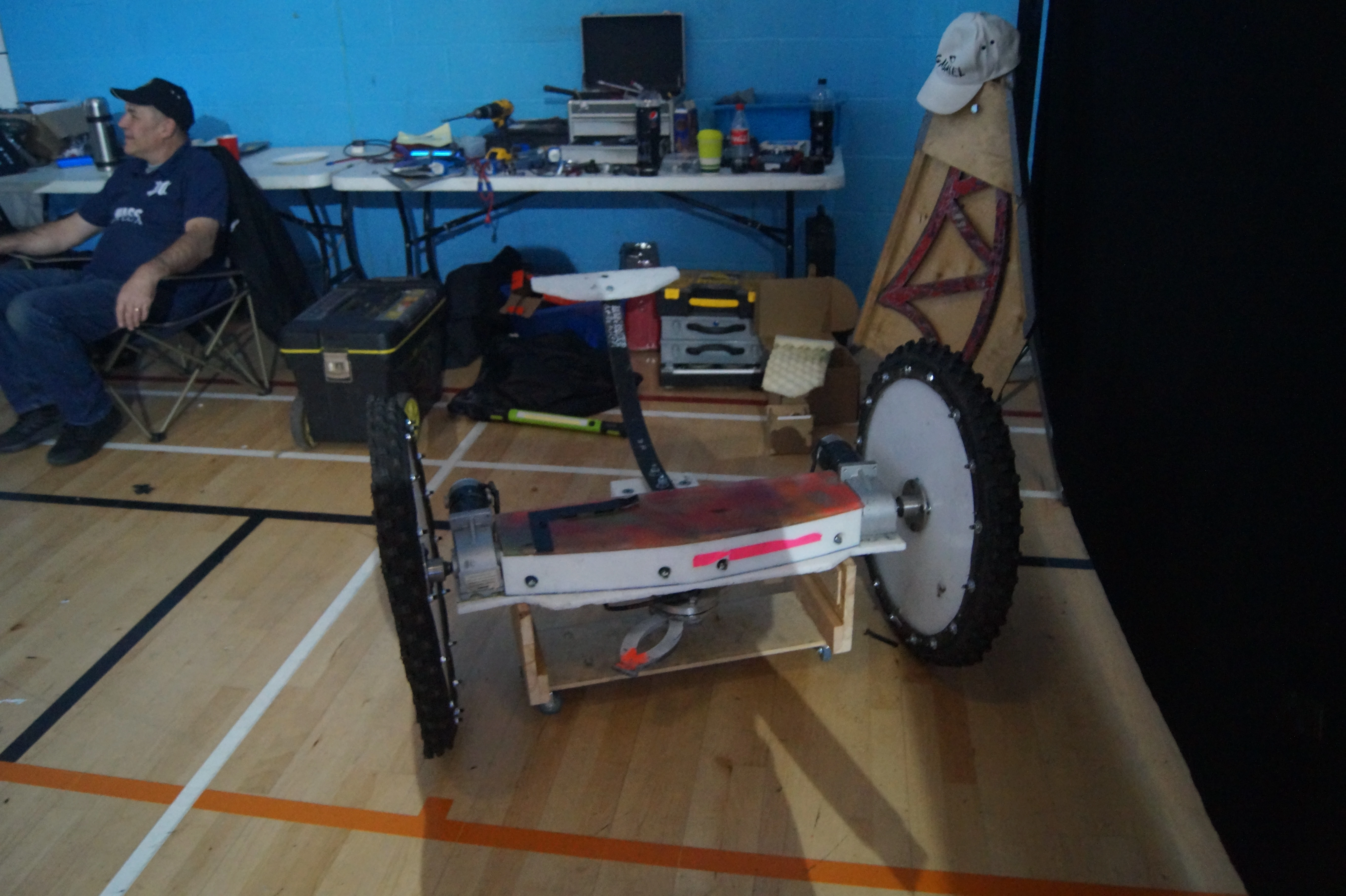 In April 2021, a new heavyweight robot, Uriel, was completed for participation in live events.[7] Featuring a large-wheeled design in common with other Team Saint machines, its armament consists of a pneumatic hammer operated by a mechanism incorporating two tyre pumps, recycled Pepsi soft drink bottles and a ram made out of a bicycle inner tube.[8] Uriel's first combat appearance came at the Robots Live! Crawley event, an event also attended by Gabriel.