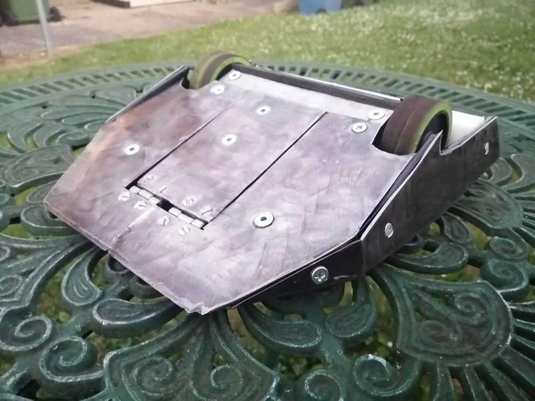 Team Tilly also built a middleweight robot, F7 known in full as Force 7, armed with a lifter, originally designed by Adam Hamilton. F7 was initially intended to enter RoboGames 2018, but pulled out[12], and ultimately first appeared at the Extreme Robots Manchester event in April 2018. There, it participated in numerous battles against heavyweight competitors, including a head-to-head against TR3 and a melee against Eric and Crackers 'n' Smash. In November 2019, F7 became the UK middleweight champion, defeating Raphael in the final. In July 2022, F7 attended the Robots Live! Stoke-on-Trent event, forming a heavyweight clusterbot entry Team Kaizen's axe-wielding machine Jibril.[13] Most recently, it fought Zadkiel at Extreme Robots Guildford in June 2023, but lost the 'Spinner Challenge' in brutal fashion after having its sides and wheels torn apart by Team Saint's heavyweight.[14][15]