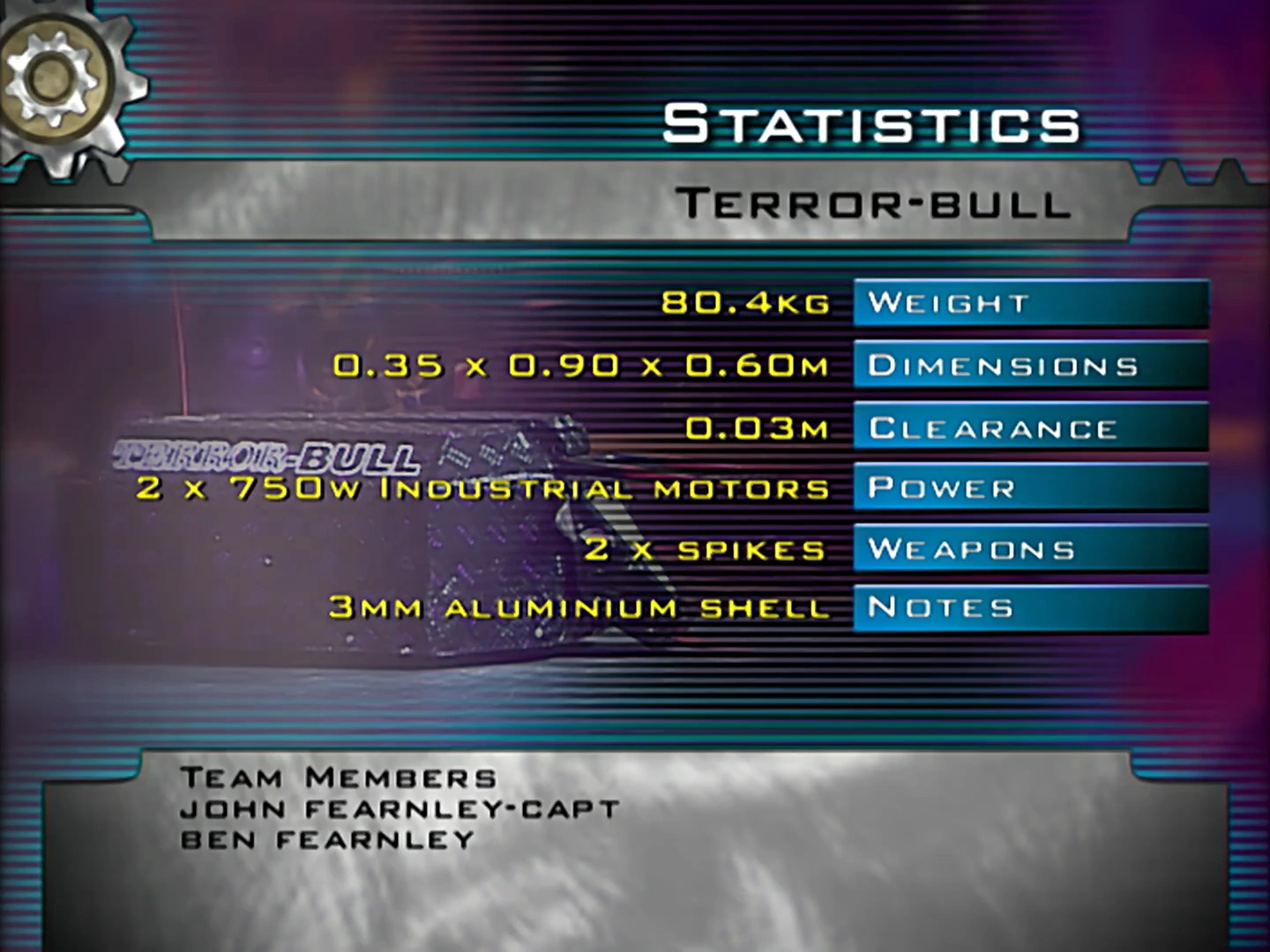 Terror-Bull contributed to very little, spending the opening moments weaving across the arena before trying to line up an attack on Cerberus. It then attempted to lift V-Max, but missed, and spun round over the Floor Flipper as V-Max flipped Cerberus over. Terror-Bull attempted to lift Cerberus back up, but again missed, before backing into Cerberus and nudging it as the House Robots came to attack it. V-Max rammed Terror-Bull towards an empty CPZ as Cerberus was pitted, although both robots progressed to the second round anyway.