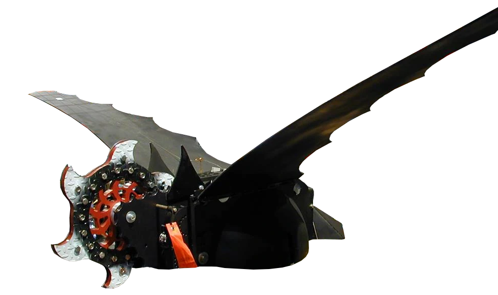 The Bat had an unusual design based on a bat, with a rounded dome-shaped body and exceptionally large side wings. The wings had a wing span of nine feet, six inches, and could be raised and lowered into various positions in unison; however, their purpose was purely decorative, and they proved prone to falling off during battles. The Bat's main weapon was a 25lb, six-toothed vertical flywheel, powered by four EV Warrior motors to reach a speed of 2,500 rpm, which proved capable of damaging and throwing heavyweight robots off the arena floor. The Bat also featured a hinged angled wedge at the rear, used to push opponents around in the event of its flywheel becoming disabled.