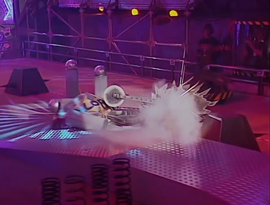 A slightly domed box robot, The Blob featured a static lawnmower blade as its ramming weapon. It could travel at 15mph but was a lot slower in practice, according to Jonathan Pearce. The Blob had a unique system where it could raise and lower its bodyshell but it never worked due to the weight of the shell. However, it could be preset to a suitable height. It could also take 12V or 24V motors. It proved to be unreliable, breaking in all three rounds of its only appearance.