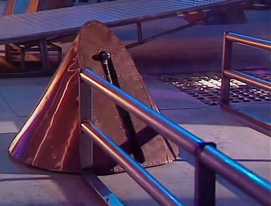From Heat G onwards, with the exception of Heat J, The Sentinel occupied this route with the help of another House Robot, usually Dead Metal. The introduction of The Sentinel and the reason for The Sentinel's appearance this late on was because the producers became frustrated with roboteers using the left route, finding it boring[1]. The Sentinel was intended to block competitors, pin them against the wall or steer them into one of the Pits, making the route considerably more hazardous in later episodes. In the Semi-Finals, The Sentinel received additional modifications which allowed its arm to perform extra movements, including the ability to swing a full 360 degrees. This enabled The Sentinel to occupy both the left-hand and centre routes at this stage.