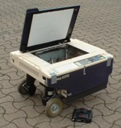 The Office Party was a robot built around a electric wheel chair armed with flippers, and designed to resemble a photocopier. The team's website humorously referred to the robot as a fighting photocopier, reinforcing its theme.