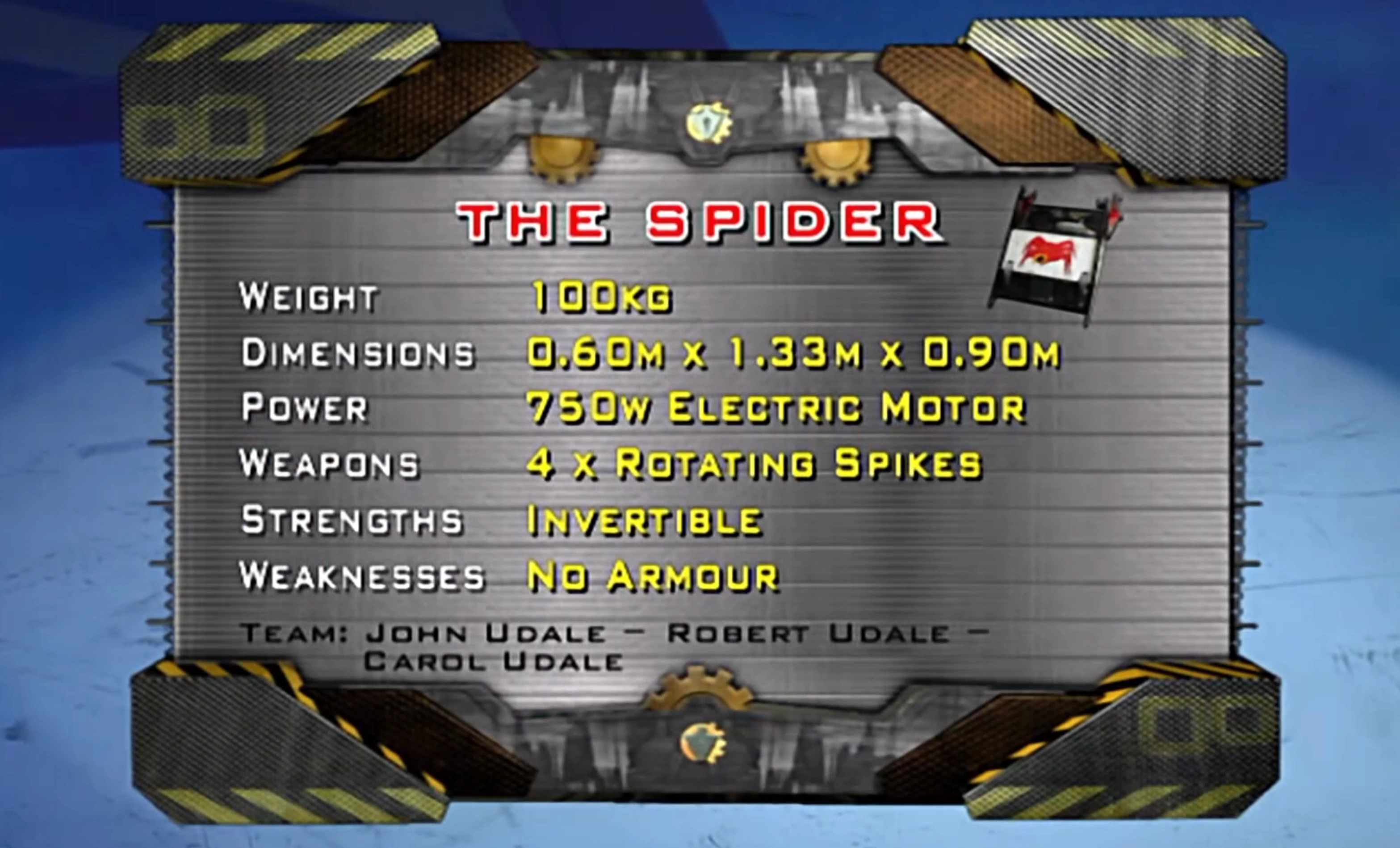 The Spider was built by Team Tarantula from Mold in Flintshire. Team captain John Udale was the lead builder of The Spider, and he was accompanied by his son Robert. His wife Carol Udale completed the team, with Carol being responsible for painting the machine. Team Tarantula had previously competed in Series 3 with Robocow, also attempting to enter Series 4 with Son of Robocow.