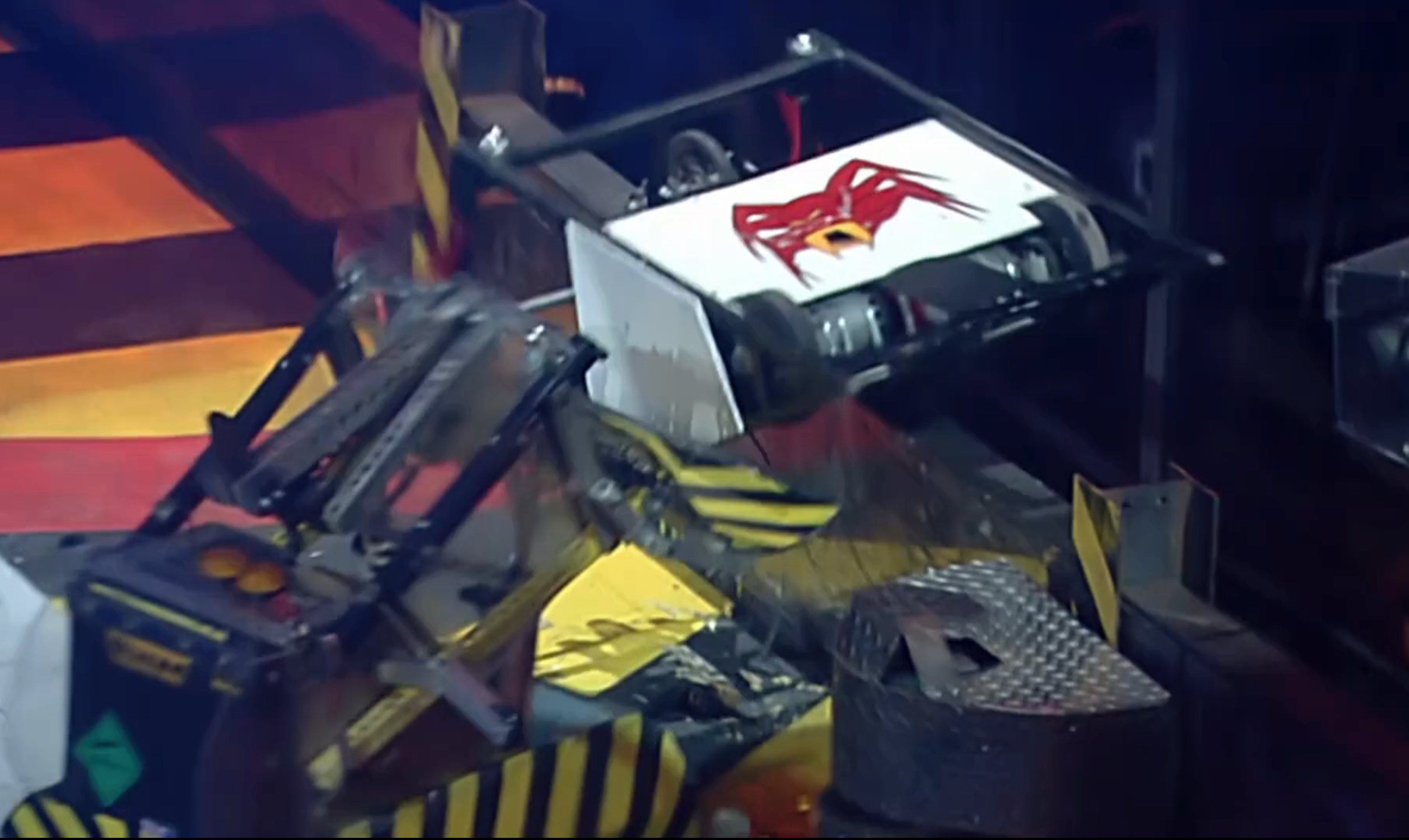 Napalm 2 and Gemini then left The Spider to fight each other, whilst The Spider's frame continued to burn. It was eventually pushed off the Flame Pit off-screen and counted out by Refbot, eliminating it from the Mayhem. After Gemini was subsequently immobilised and counted out by Refbot, Shunt pushed The Spider, which was badly burnt and still partially on fire, towards the Floor Flipper.