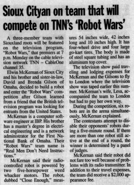 David Gilson was an electronics engineer who worked as a network administrator for the First National Bank of Omaha, having earned a masters degree in electrical engineering. He drove the robot in all its appearances. Elwin McKernan was a computer software engineer, who helped David build The Termite and Close Enough[1][2].