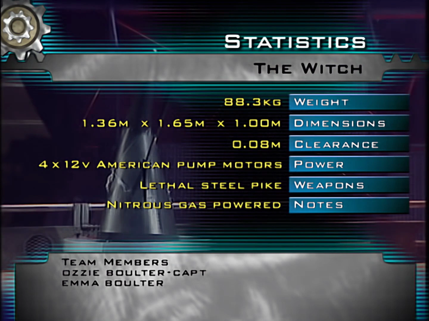 The Witch was a silver and black robot similar in design to Wizard, featuring a circular fibreglass and plastic body with a tall alloy cone themed around a witch's 'hat' mounted on top. Its weapons were a set of steel spikes along its rim and a pneumatic axe modeled on a witch's broom, while the robot exhibited a high top speed as a result of its 12V American pump motors. Even so, The Witch's weapons proved ineffective and its killswitch lay exposed on its top armour, leaving it vulnerable to being easily switched off as proven during its only battle.