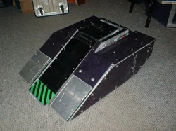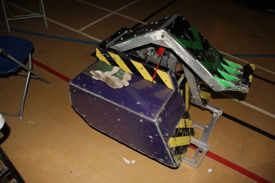 Thorak was a box wedge-shaped robot painted purple with black, green and yellow hazard stripes, and armed with a pneumatic flipping arm. Its armour consisted of 6mm aluminium with 6mm polycarbonate, and the robot cost £2000 to build.