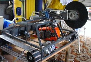 Thud was a large, tank-like robot using tracks as its means of locomotion, powered by a 12V starter motor and mainly built out of scrap and donated parts. Its weapons were a large circular saw mounted on an arm - which Team Thud referred to as a 'chainsaw' on their website - and a rear spike. However, Thud's saw failed to work at all before its only battle, which combined with its slow speed and turning circle greatly hampered its performance in the Super Heavyweight Championship.