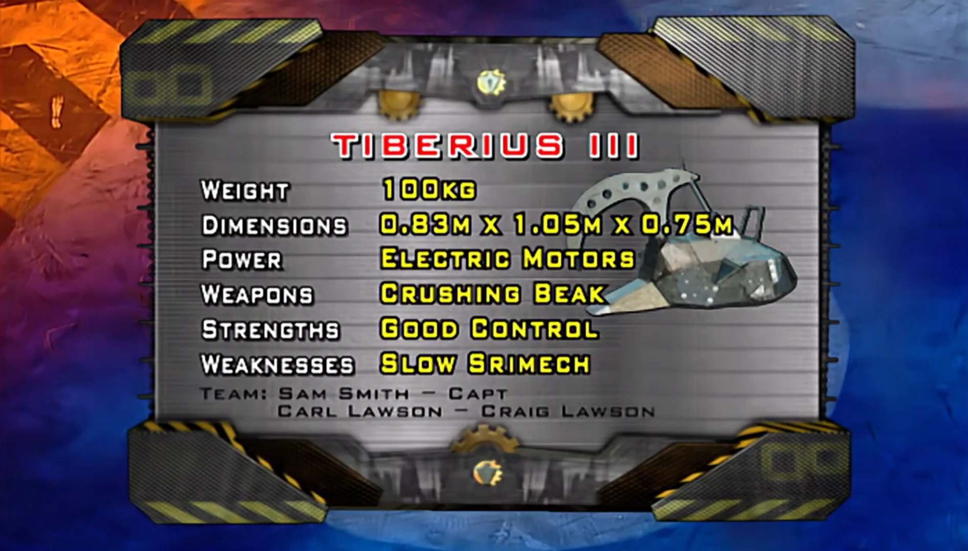 - "Knocked out in the heats of Series 4. Electric powered with two seven hundred and fifty watt motors and with a hydraulic ram producing four tonnes of force at the tip, this emperor, Tiberius plans to rule!"
