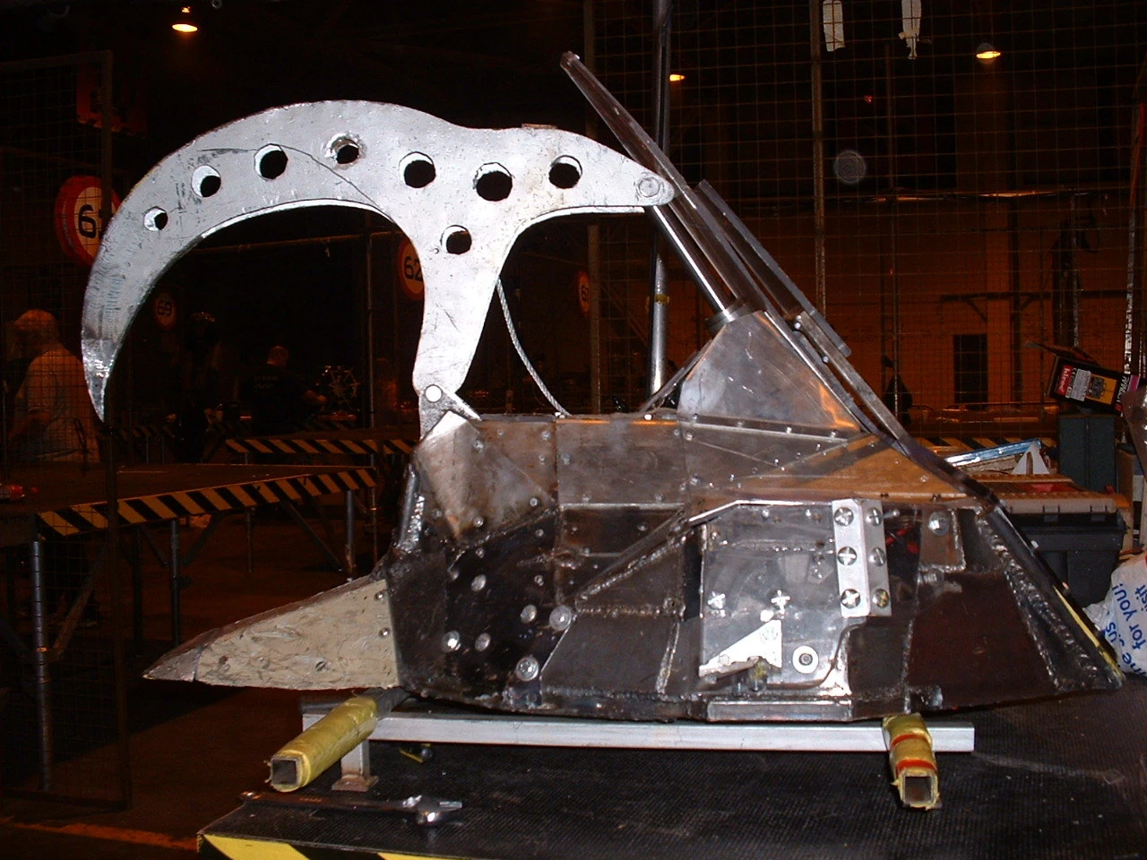 The original Tiberius was a basic two wheeled box-wedge shaped robot with a large steel spike powered by a car jack delivering 1.5 tons of pressure, which could pierce through stainless steel. The machine could pull a Volkswagen Estate with the handbrake on. This version had a welded steel chassis, gears from a motorbike, and travelled at 8mph. The armour was polypropylene, lexan, nylon and steel.[1] Like TX-108, this version had a crusher which was pulled down instead of pushed down.