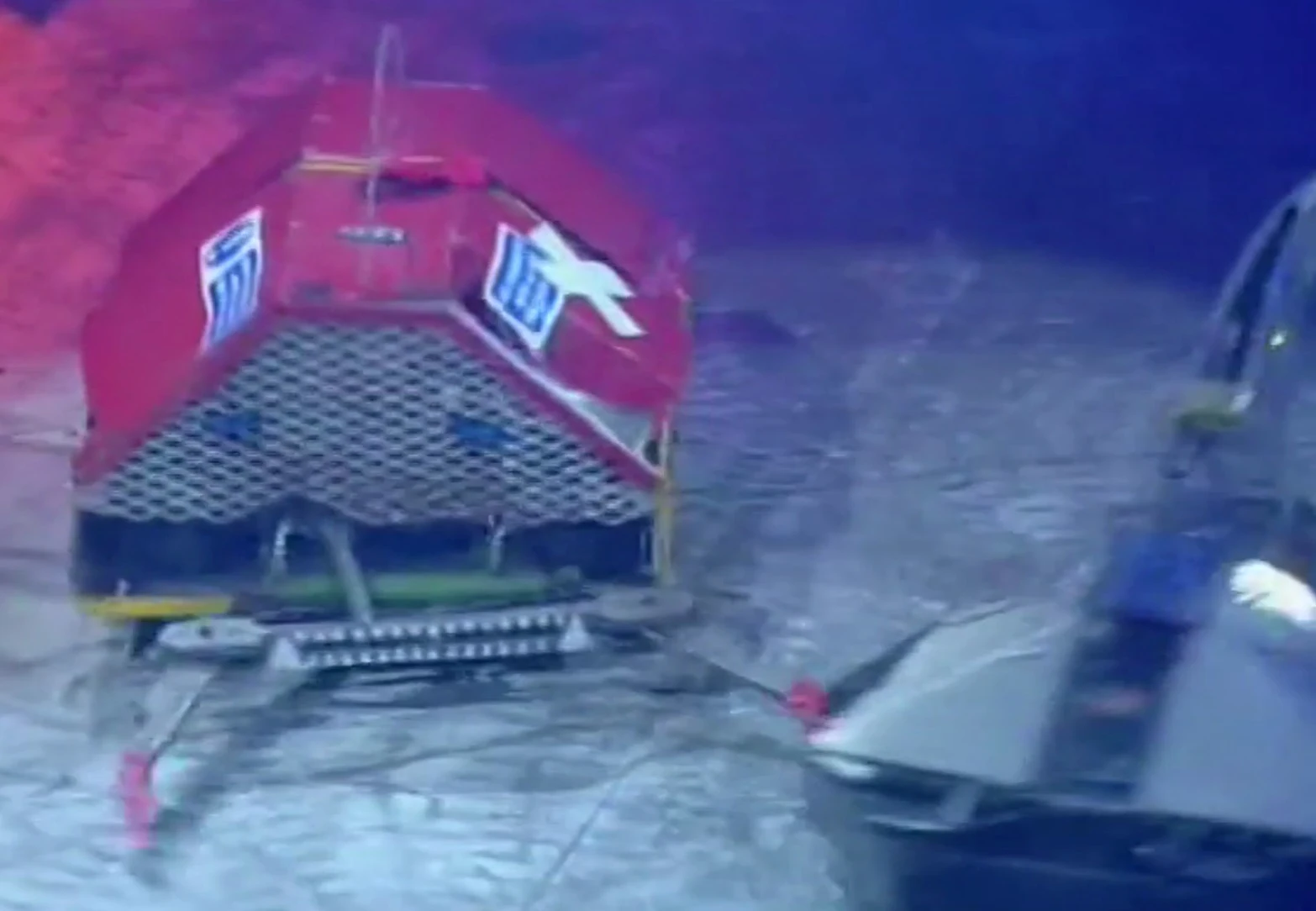 - "Look at that, cleaving away, Tiberius has got inside, and at the moment is well on top. I wonder what damage it's causing in there, to the electronics of Monad."