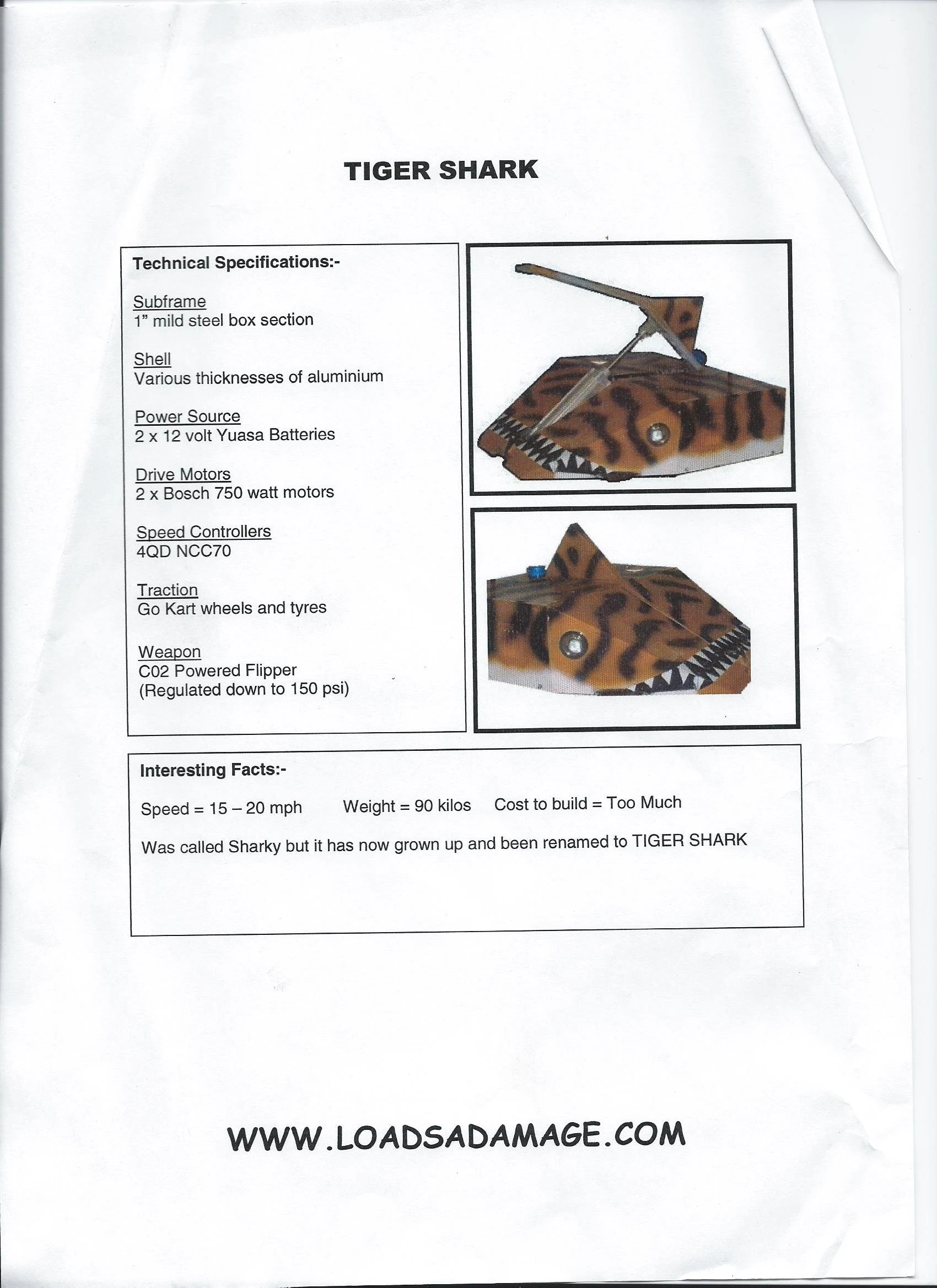 - "Tiger Shark is built for speed and its ramming capability. From a standing start it can reach 20mph in one second. With the addition of a pneumatic flipper it should make for a fun time in the arena - if you can catch us that is!"