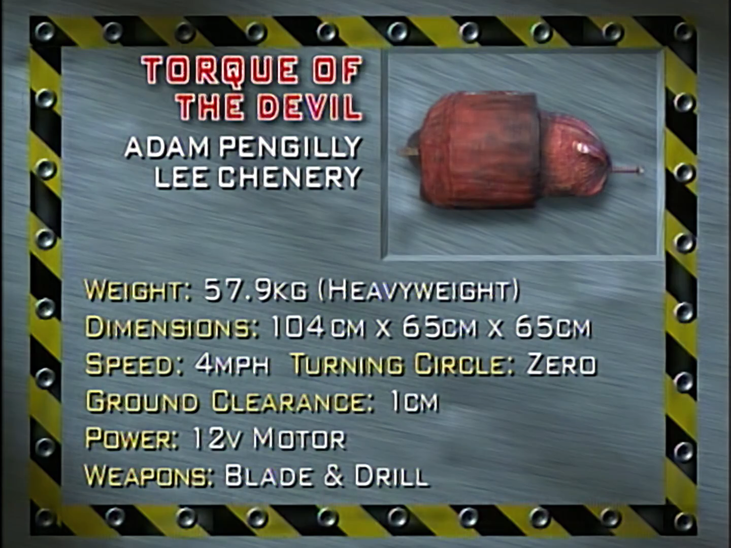 It was powered by four batteries[2] and a 12V motor, giving a top speed of 4mph, and its weapons were a rotating spiked drill at the front, and a Vertical flywheels with four teeth bolted on. The front drill had three spikes on the tip, and was powered by a starter motor, and the rear flywheel was notable for being the first vertical flywheel in Robot Wars. While boasting impressive weapons by Series 1 standards, Torque of the Devil suffered from slow speed, fragile armour and poor manoeuvrability which adversely affected its performances throughout its Heat. It also proved unreliable, due to using a starter motor.