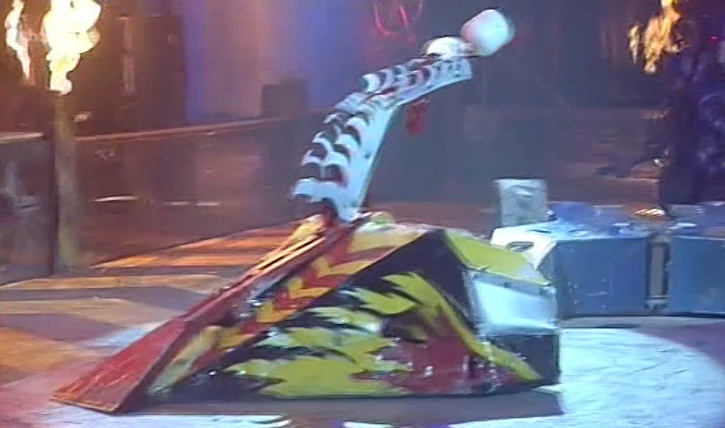 Gravity slipped away from Tough as Nails again, before another Tough as Nails drive over the top of Gravity saw the flipper robot throw itself over as it mistimed the activation of its weapon. Gravity quickly sprung back onto its wheels and flipped Tough as Nails over, but Tough as Nails then came in with a drive itself which allowed it to shovel Gravity towards the Pit of Oblivion, where it dumped its fellow Semi-Finalist from the Seventh Wars. With both of its opponents pitted, Tough as Nails progressed to the heats of the Third World Championship.